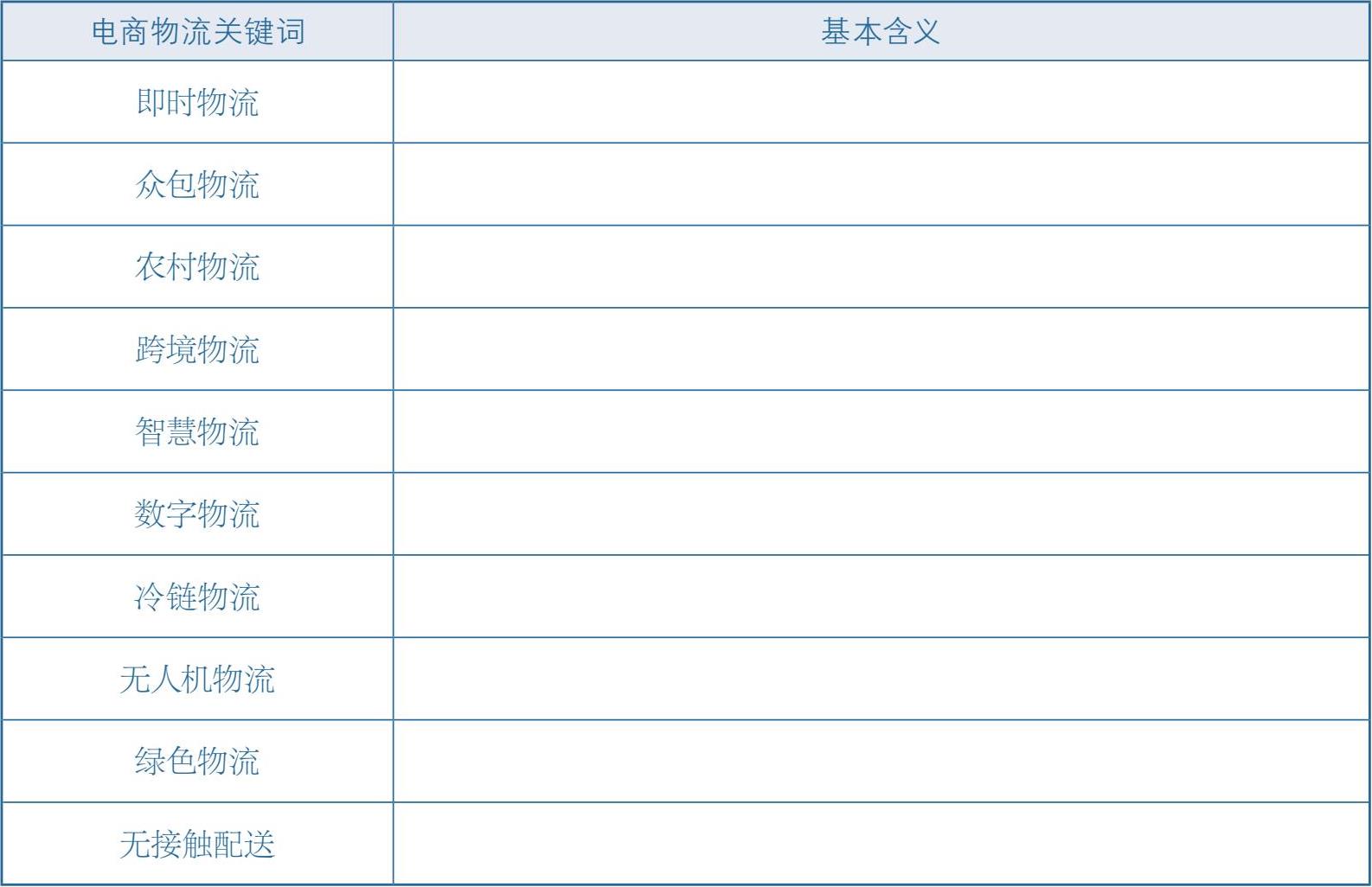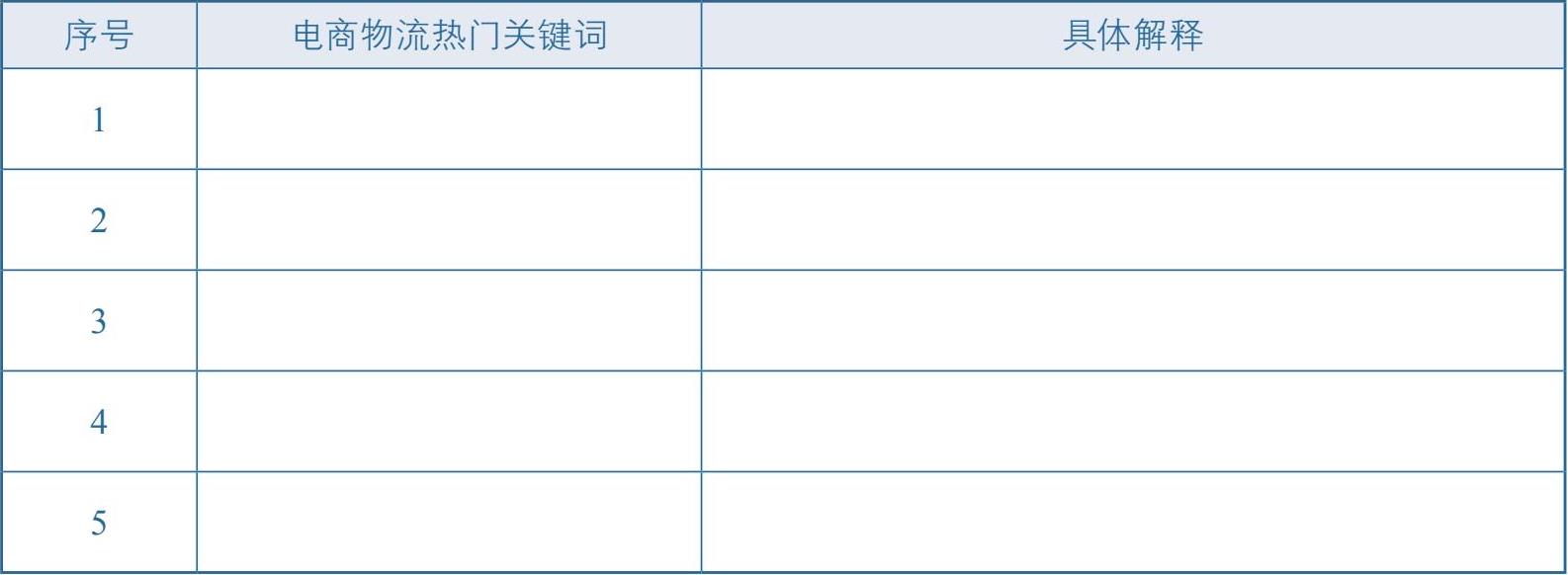 根据个人经验或者上网收集5个与电商物流相关的热门关键词,并说出其含义或者内容,完成表1.1.2。