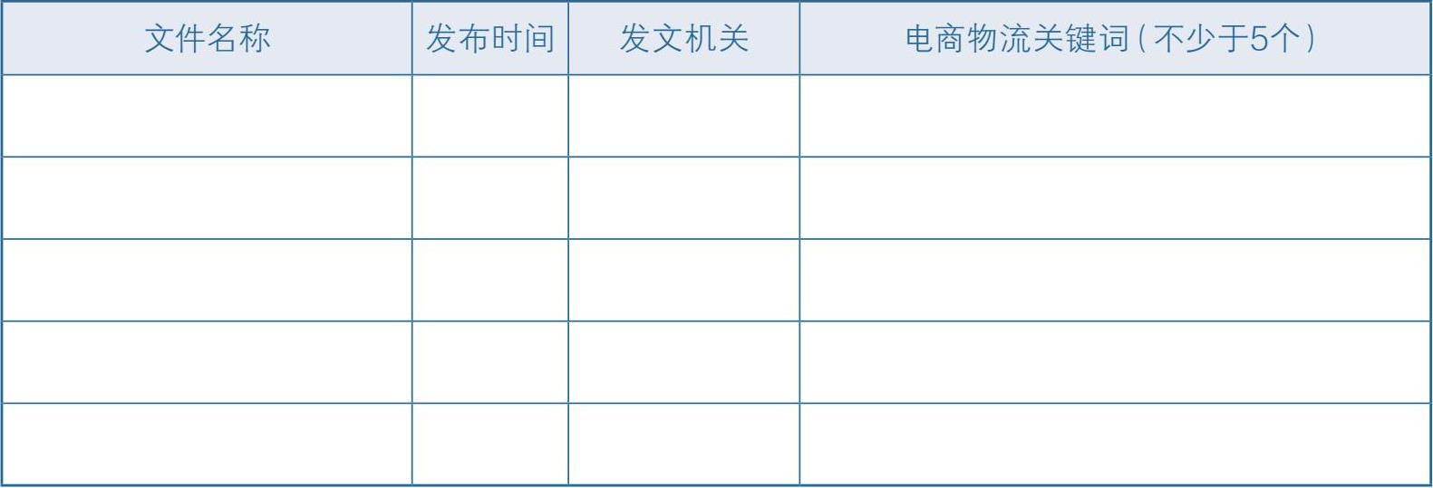 选择5个最新的与电商物流相关的政策,学习其相关内容,归纳出关键词,完成表1.1.3。