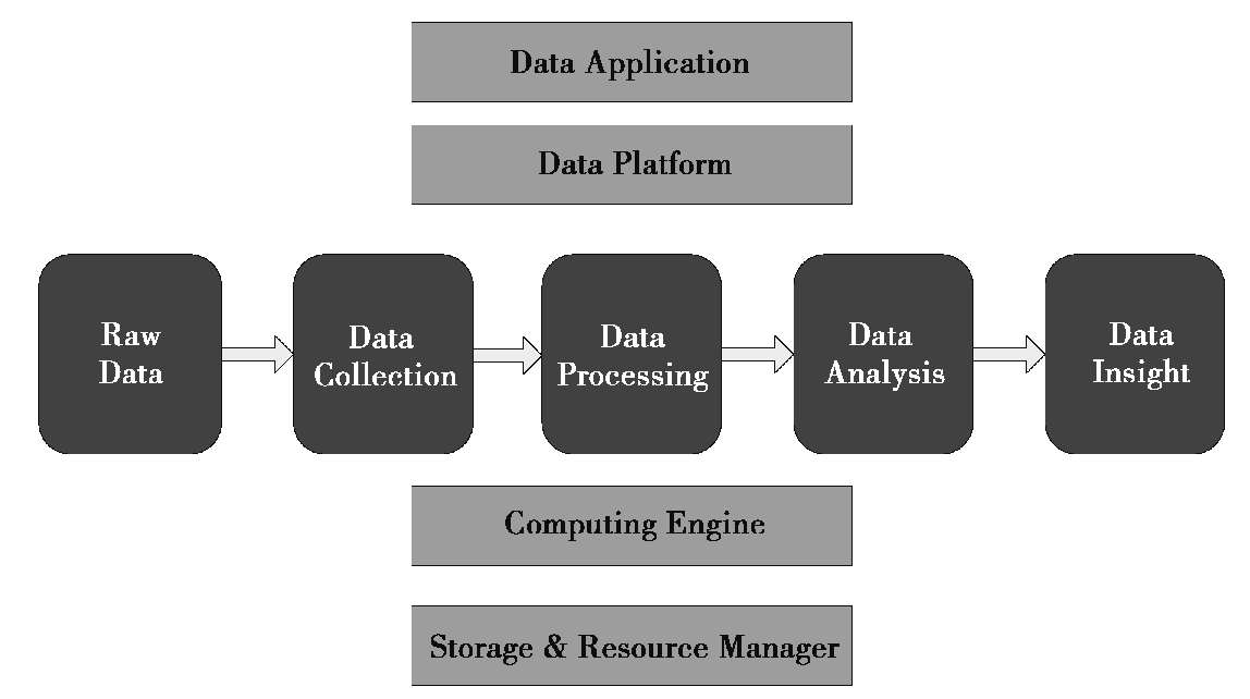First,before we can get anywhere,we will need to make clear what exactly “Big Data” is. The concept of Big Data has been around for more than 10 years,but there has never been an accurate definition,which is perhaps not required. Data engineers see Big Data from a technical and system perspective,whereas data analysts see Big Data from a product perspective. But,Big Data cannot be summarized as a single technology or product,but rather it comprises a comprehensive,complex discipline surrounding data.We can look at Big Data from two aspects:the data pipeline(the horizontal axis in the following figure)and the technology stack(the vertical axis in the following figure)as is shown in Fig. 2.1.