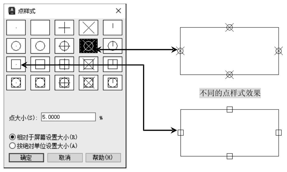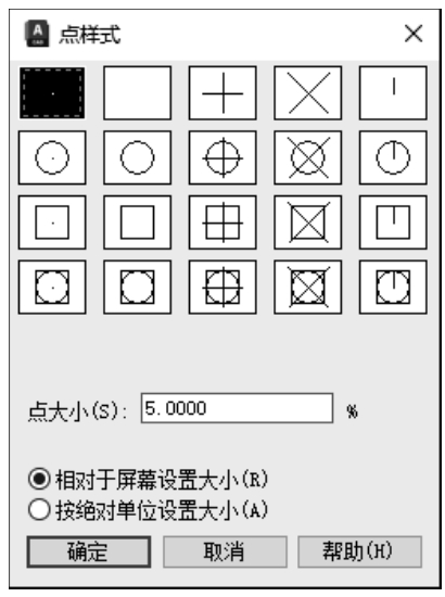 执行“点样式”命令后,将弹出“点样式”对话框。在该对话框中,可在20种点样式中选择所需要的点样式图标。点的大小可在“点大小”文本框中设置,可以根据需要选择“相对于屏幕设置大小”或“按绝对单位设置大小”单选按钮,如图3-2所示。