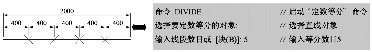 例如,要将一条长2000的线段等分为5段,首先应单击“绘图”面板中的“定数等分”按钮 ,或者在命令行中输入“DIV”命令,提示“选择要定数等分的对象:”时,选择该线段;然后在“输入线段数目或[块(B)]:”提示下,输入等分数目5,即可将长2000的线段等分为5段,如图3-4所示。