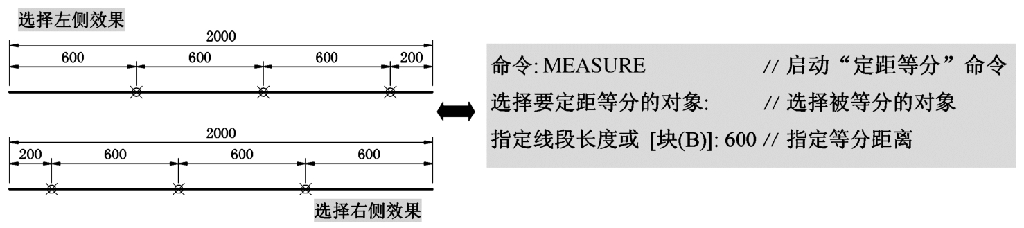 例如,要将一条长2000的线段按照间距为600进行等分。首先执行“定距等分”命令,提示“选择要定距等分的对象:”,选择该线段的左端或右端;然后在“指定线段长度:”提示下,输入要等分的间距值600,其操作步骤如图3-6所示。