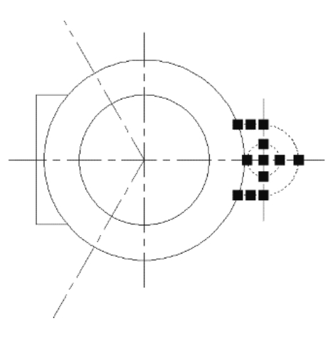 Step 17 分别将右侧的小圆、圆弧、水平线段选中,将出现多个夹点,表示下一步需要阵列的对象,如图3-95所示。