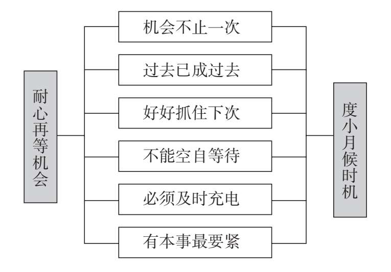 机会不会一生仅有一次,这一次拿不到,不必后悔。应该针对自己的弱点,力求充实,以便下一次机会出现的时候,好好抓住。要“度小月乃候时机”。时机不利时,要“守”、要“待”,叫作“度小月”,也就是说,并不是空等待,而是把握时间充电,增强自己的实力,随时有机会,马上可以表现出来。不等待干着急,空等待到时候还是拿不到。一个人的本事最要紧,不可不利用等待的时间,及时充电。如果希望获得合理的激励,那么充实自己实在是刻不容缓的事情(如图 2–5)。