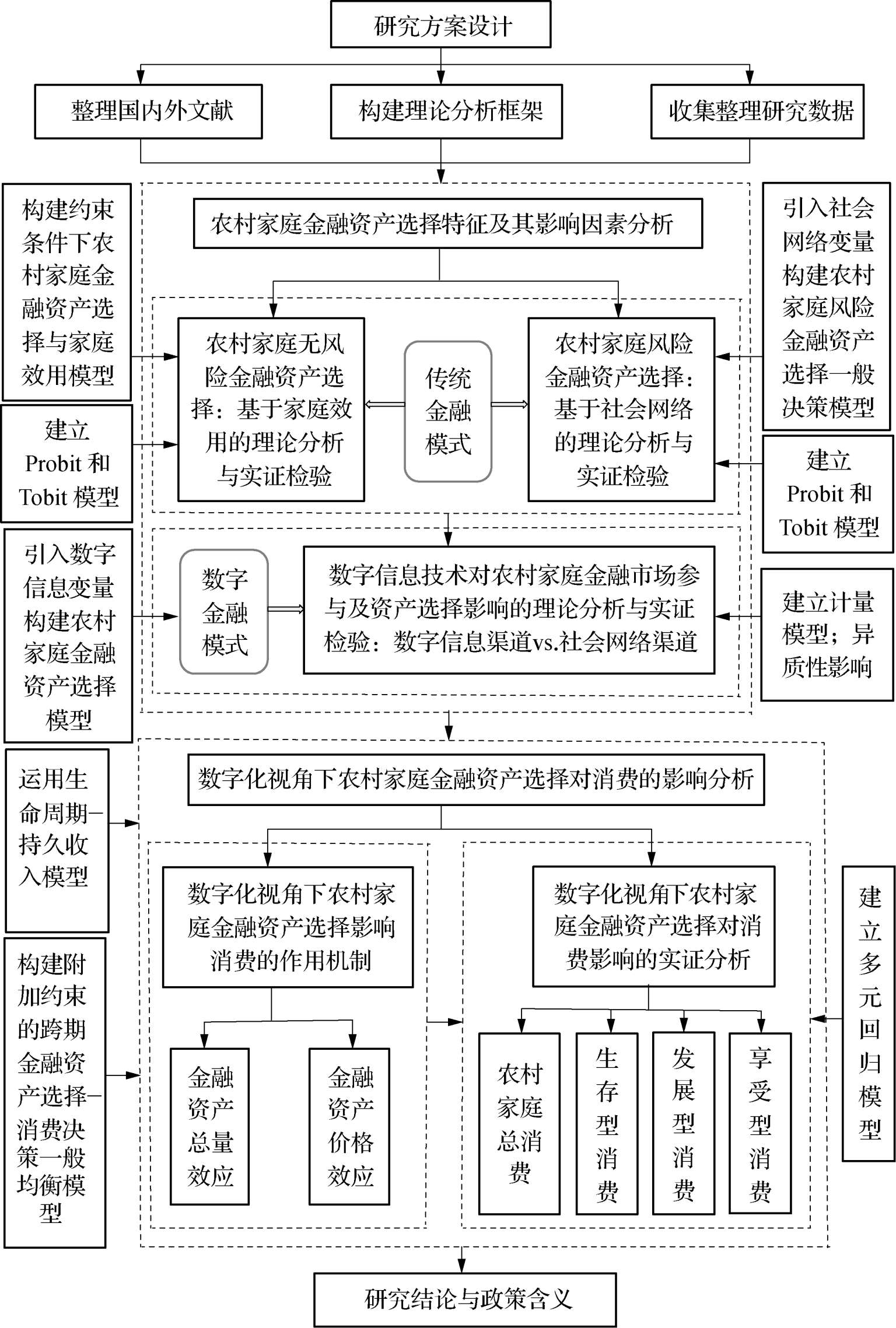 本文基于理论和现实两个层面,采用规范分析和实证分析相结合的研究方法,考察数字化视角下农村家庭金融资产选择及其对消费的影响问题。一方面,结合本研究具体目标、框架设计和基本脉络,运用全国范围的农村家庭金融调查微观数据进行描述统计分析,从总体上考察农村家庭金融资产基本情况与选择行为表现,同时结合我国数字信息技术发展和地区经济金融发展的现实情况,由此分析农村家庭金融资产选择行为基本特点。另一方面,遵循经济理性这一基本假定,从理论上解释预算约束和借贷限制下的农村家庭无风险金融资产的内在选择动机和社会网络在其风险金融资产选择过程中的内在规律,进而阐述数字信息技术对农村家庭参与金融市场选择资产的影响机制,以及数字化视角下农村家庭金融资产选择影响消费的作用机理;并在此基础上,构建Probit和Tobit计量模型,检验农村家庭无风险金融资产(储蓄现金)和风险金融资产(民间借出款)选择偏好问题,以及数字信息渠道和社会网络渠道对农村家庭金融市场参与及资产选择的影响差异,进而建立多元回归模型分析探讨数字信息化趋势下农村家庭金融资产选择对消费的影响效应。