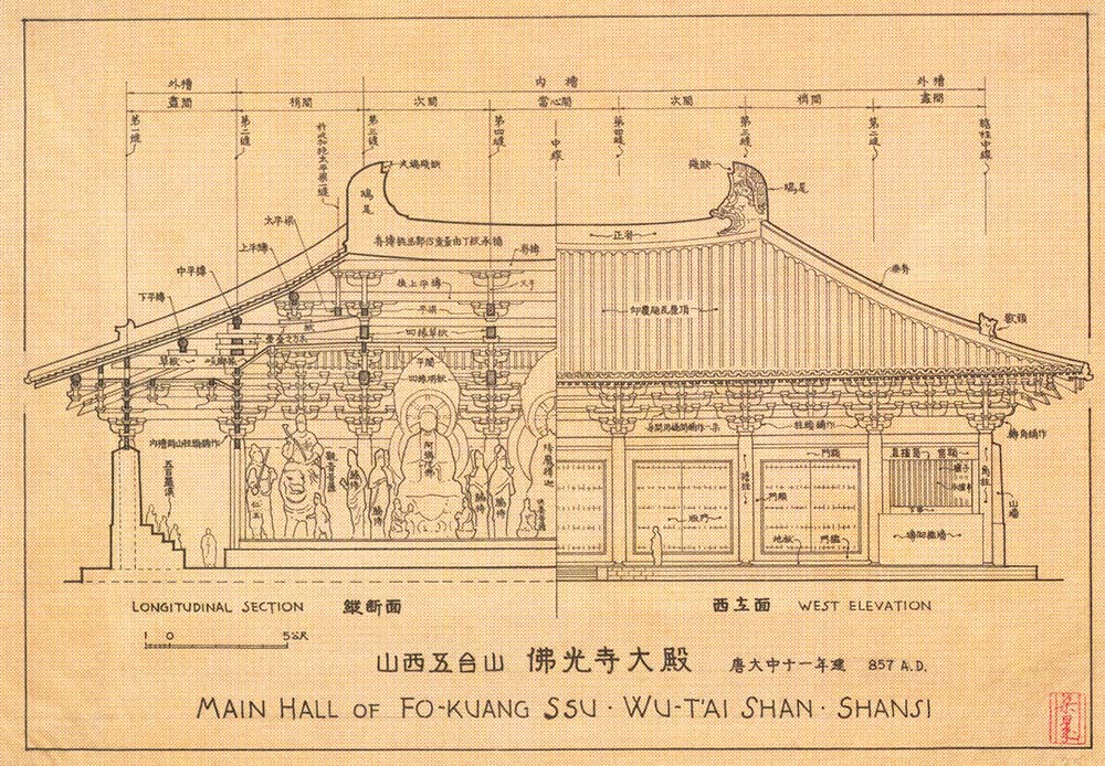 佛光寺大殿纵断面、西立面图(梁思成绘)
