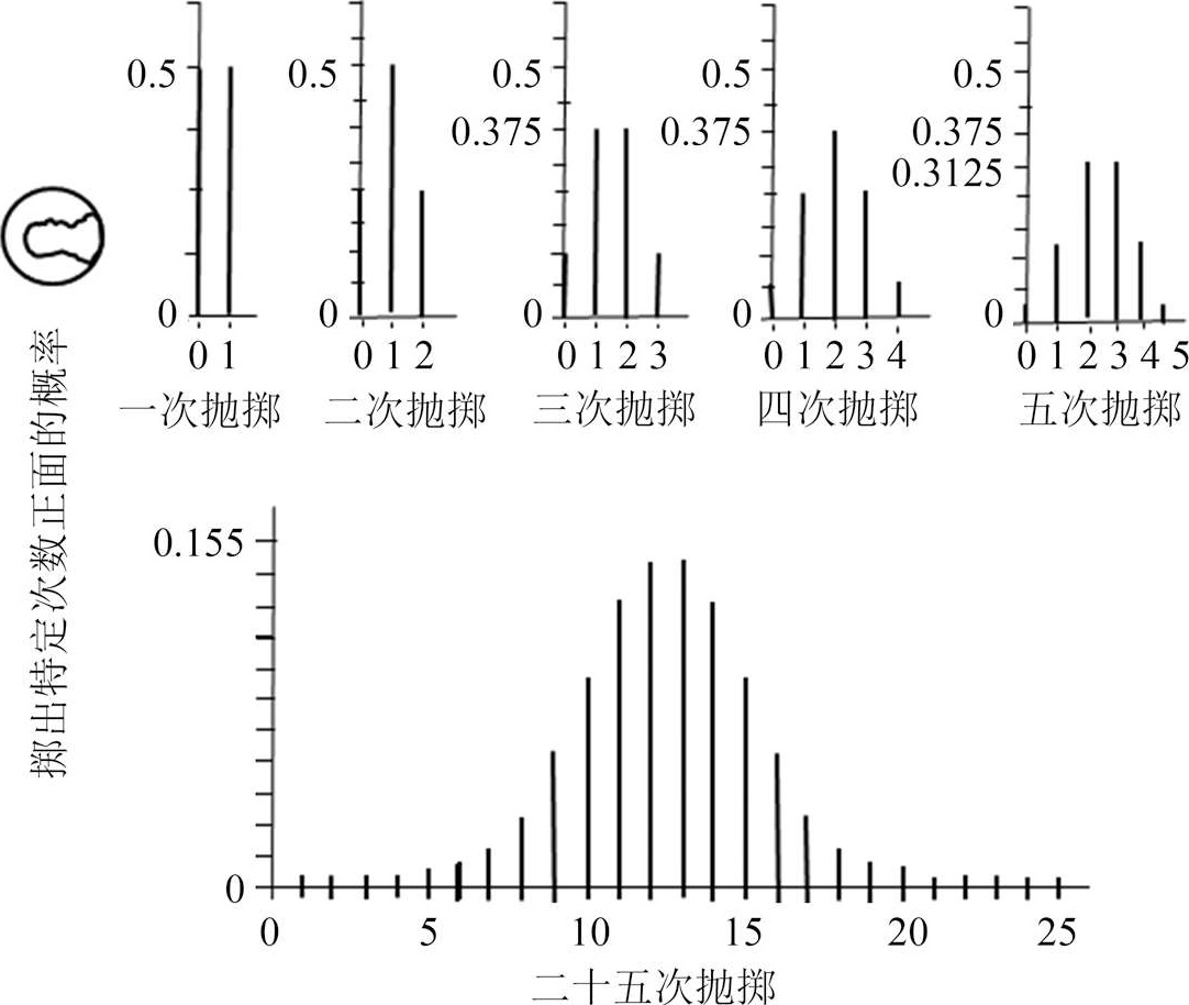 图 2-12 当一枚硬币被抛掷一次,两次,三次,四次,五次和二十五次时正面出现次数的概率