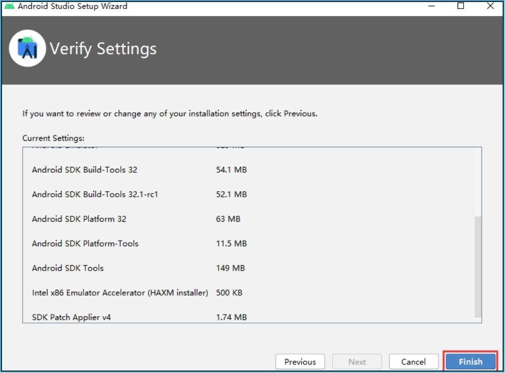 在设置项验证界面中,列出需要下载的工具组件,确认无误后单击【Finish】按钮,如图1-19所示。