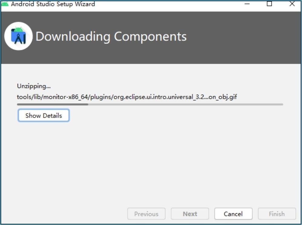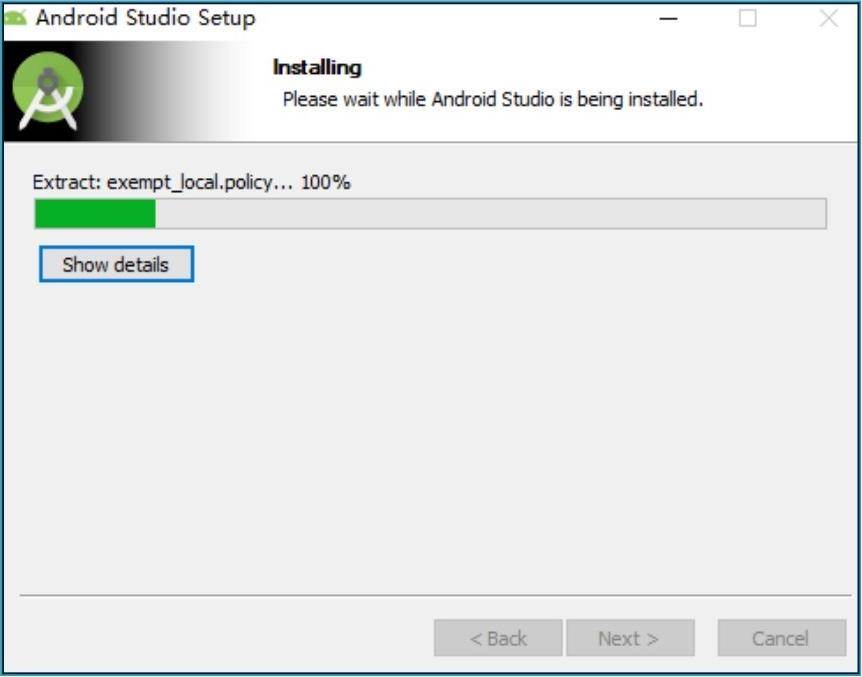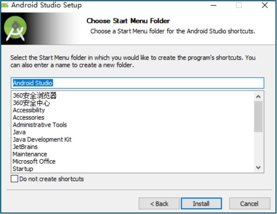 Android Studio开发工具默认的【开始】菜单选项名称为Android Studio,可根据实际情况更改。设置完成后,单击【Install】按钮,出现图1-10所示的安装进度界面。