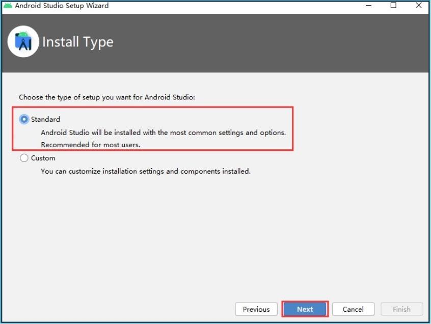 在安装类型界面中,选中【Standard】单选按钮,表示以标准模式安装Android Studio开发工具,再单击【Next】按钮,如图1-17所示。