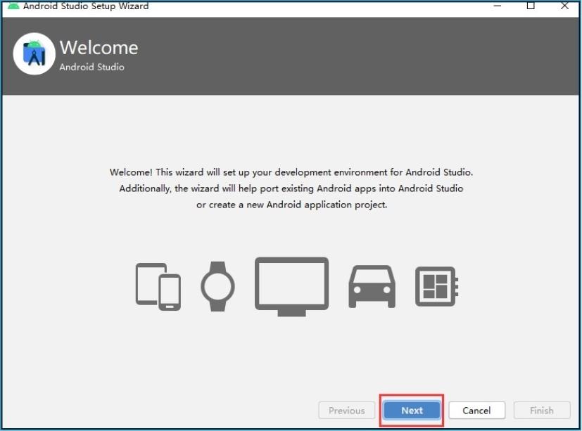 启动android-studio-ide-202.7486908-windows.exe程序,显示安装向导欢迎界面,如图1-6所示。