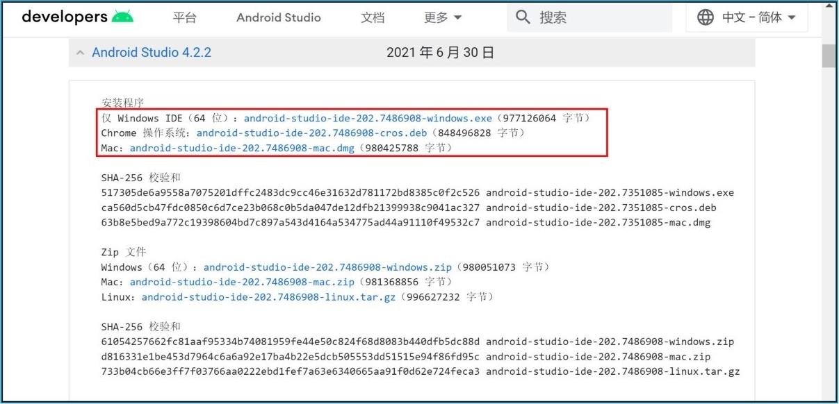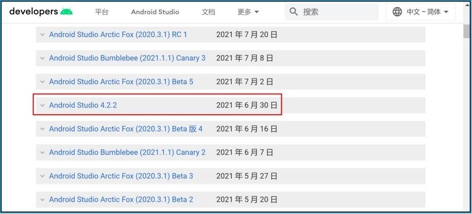 推荐初学者使用正式版本中的非最新版本(Android Studio 开发工具可以在Android 开发者官网上搜索并下载),下载链接中若含有 Beta、Canary、RC 等均为非正式版本。这里选择Android Studio 4.2.2,如图1-2所示。