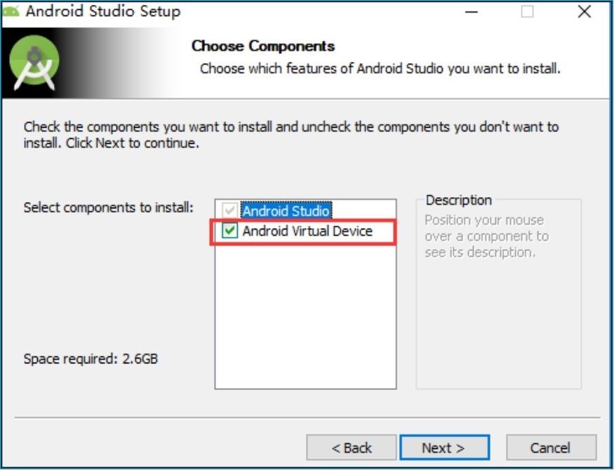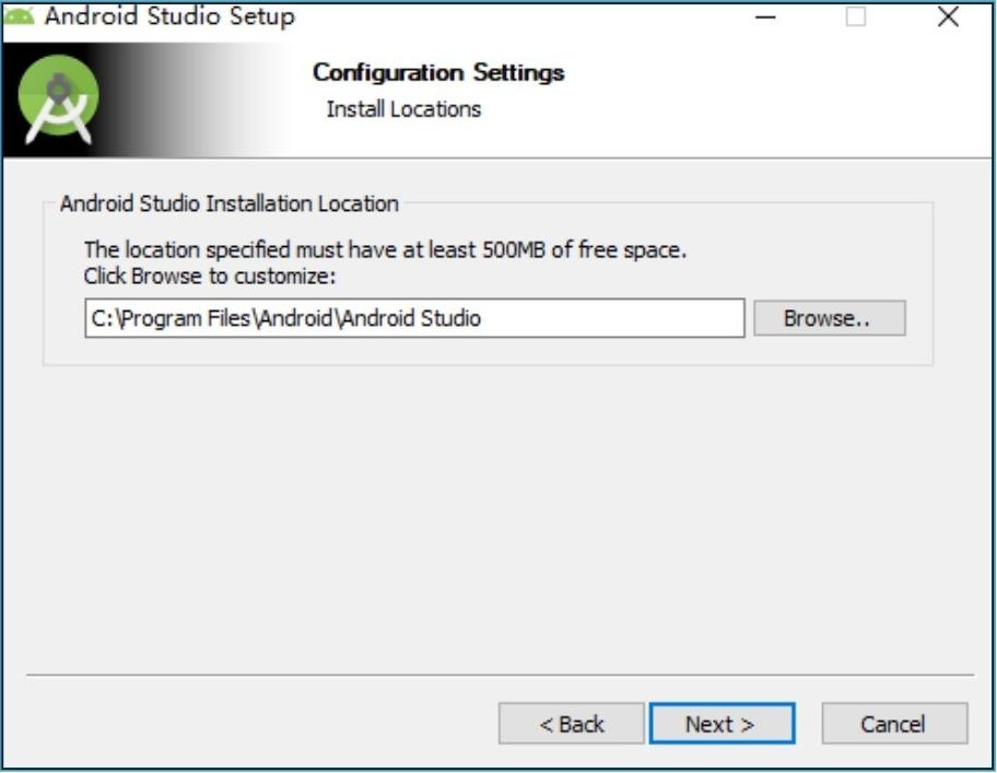 在组件选择界面中,【Android Studio】复选框为必选项且不可更改,选中【Android Virtual Device】(Android虚拟机驱动)复选框,单击【Next>】按钮,出现图1-8所示的设置安装路径界面。