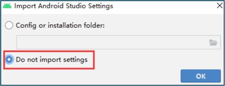 首次启动Android Studio时,系统会要求导入配置文件。这里选中【Do not import settings】单选按钮,再单击【OK】按钮,如图1-13所示。