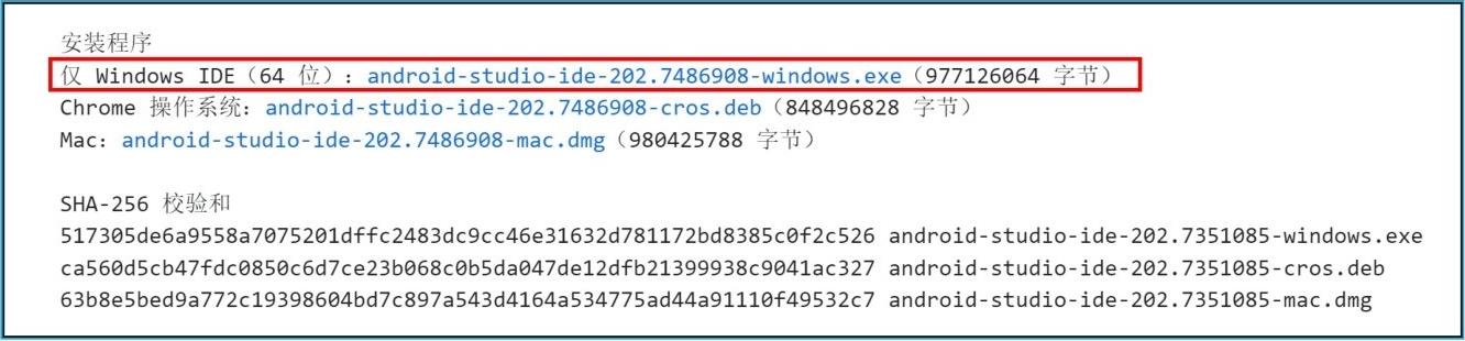 常用计算机操作系统主要有Windows、macOS、Linux等,在下载时应选择适合操作系统类别的链接。这里选择可执行文件(.exe)格式中适合当前计算机所搭载的 Windows10(64位)操作系统的下载链接【仅Windows IDE(64位):android-studio-ide-202.7486908-windows.exe】,如图1-4所示。
