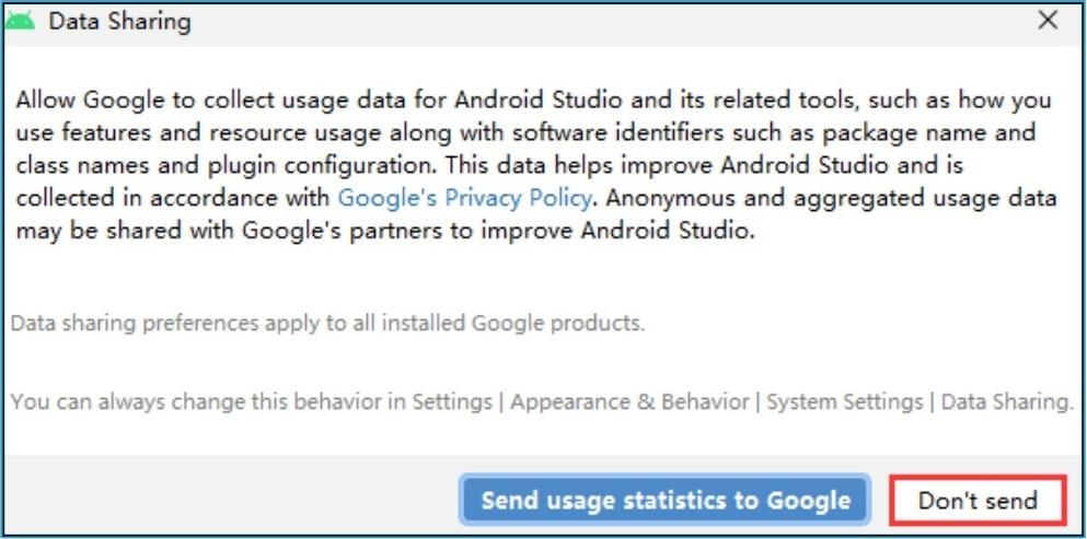 首次运行Android Studio时,系统会询问是否向谷歌公司发送个人信息,这里单击【Don't send】按钮,如图1-14所示。