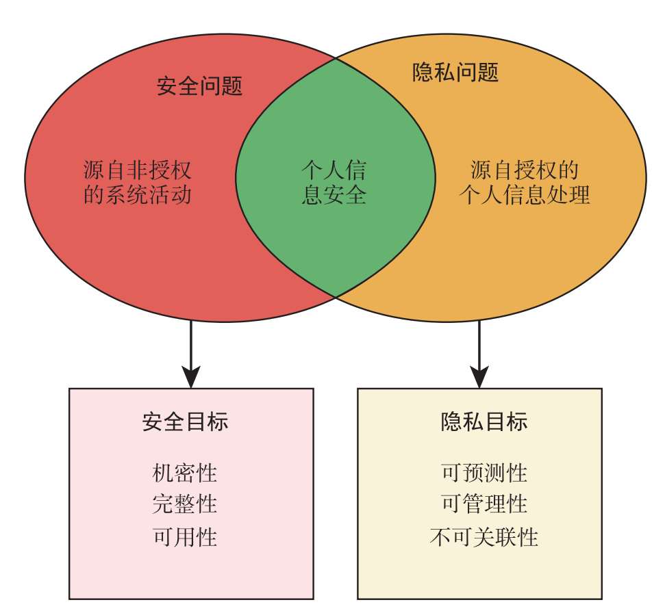 隐私与安全是一对极易混淆的概念,图2.2从问题与目标两个角度对它们进行了辨析。隐私问题一方面源自对个人信息的授权处理,另一方面源自对个人信息的非授权访问,而后者被认为是安全问题的子集。因此,安全与隐私并不是简单的包含关系。尽管二者之间有所重叠,但有着不同的关注重点。仅保证安全并不足以保护隐私,反之亦然。有时,过强的安全措施甚至可能侵犯隐私。例如,用于拦截恶意软件的流量监控有可能会检查人们常规的浏览记录。