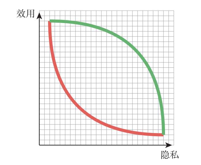 隐私保护面临的一个关键问题是隐私与 效用 (utility)之间的冲突。通常,效用一词指在合法情况下,多个数据消费者或使用者的可量化利益。这种利益往往源自信息的流动,而提供隐私则意味着需要对信息流加以限制和规范。图2.3体现了隐私与效用的权衡,更先进的隐私理念与技术必将推动隐私与效用的帕累托均衡“由红转绿”。