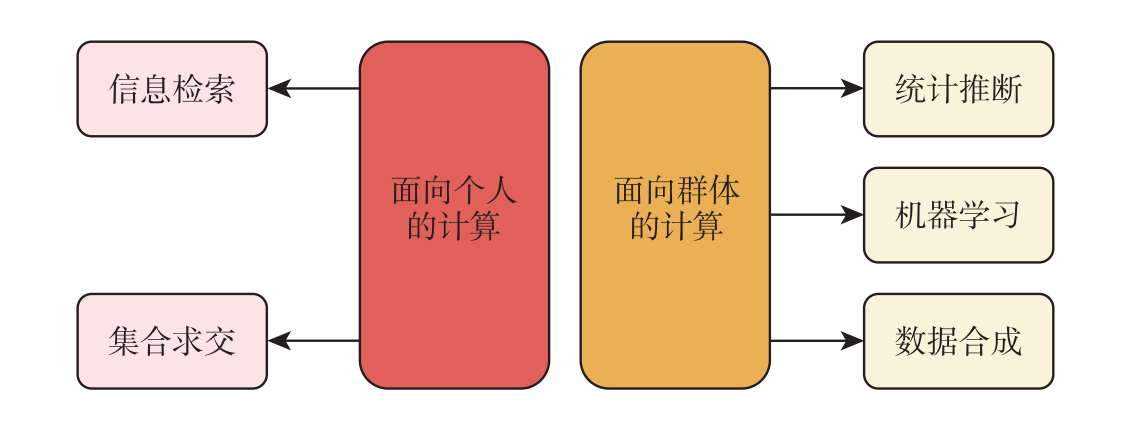 根据输出性质的不同,计算任务可以分为面向个人的计算和面向群体的计算,如图2.5所示。 面向个人的计算 是指数据的处理结果仍然针对个人,会对个人的活动产生直接或间接的影响,如信息检索、集合求交等。 面向群体的计算 是指数据的处理结果仅与群体相关,不针对具体个人进行识别、分析或评估,如统计推断、机器学习和数据合成等。下面简要介绍这些任务。