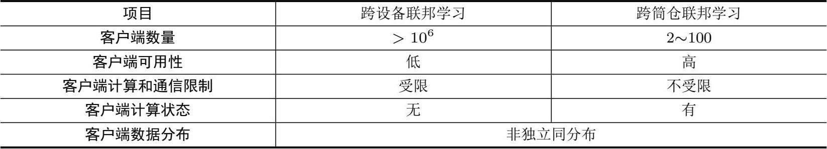 在实际应用中,联邦学习具有两种不同的设定,即 跨设备联邦学习 (cross-device FL)和 跨筒仓联邦学习 (cross-silo FL)。前者联合大量的移动设备进行协同学习,而后者联合多个大型组织机构进行协同学习。二者的差异主要体现在客户端数量、客户端的稳定性、计算和通信的限制,以及与服务器连接的状态等方面,如表3.1所示。