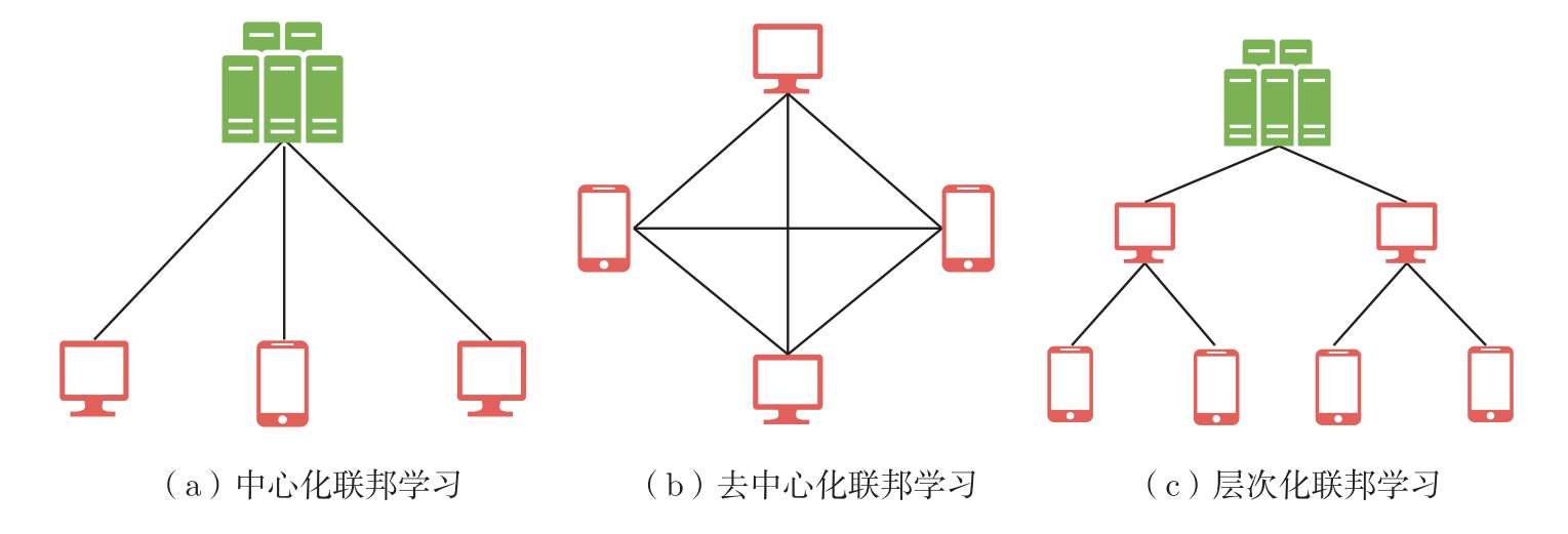 根据联邦学习拓扑结构的不同,联邦学习可以分为 中心化联邦学习 (centralized FL)、 去中心化联邦学习 (decentralized FL)及 层次化联邦学习 (hierarchical FL)。图3.3展示了3种不同拓扑结构的联邦学习。在中心化联邦学习中,服务器协调模型训练的整个过程,负责聚合各个客户端的本地模型并更新全局模型。与中心化联邦学习不同,去中心化联邦学习不需要服务器,而是用客户端之间的对等通信取代了客户端与服务器之间的通信。去中心化联邦学习降低了中心化联邦学习中的服务器出现故障后模型无法继续训练的风险,但是存在通信开销较大、通信滞后的问题。层次化联邦学习是中心化联邦学习和去中心化联邦学习的折中方案,兼具二者的优点。层次化联邦学习设置有多个子中心节点,客户端与各自对应的子中心节点进行通信,然后由子中心节点与服务器进行通信,协作完成整个联邦学习训练过程。层次化联邦学习避免了大量的客户端与单一的服务器之间的频繁交互,并且能够有效地提升实际场景下模型训练的效率。