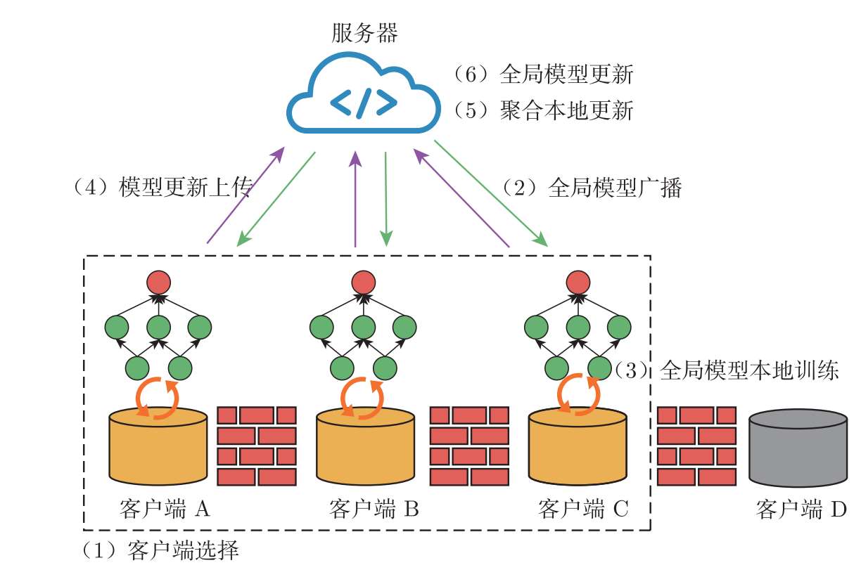 为了解决上述两种方法的局限性,联邦学习应运而生。作为一种分布式机器学习范式,联邦学习的多个客户端在服务器的协调下协作解决机器学习问题。在联邦学习中,各个客户端的数据始终存储在本地,并且各个客户端和服务器之间仅交换客户端本地训练生成的模型更新。