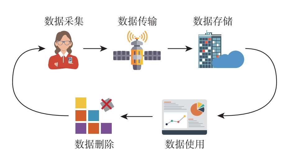 通常,隐私风险源自数据生命周期的各个阶段,包括数据采集、传输、存储、使用和删除等,如图1.4所示。数据采集是指直接或间接从个人或机构获取数据的过程。数据传输是指将数据从一个实体发送到另一个实体的过程。数据存储是指使用磁盘、云存储服务等载体将数据持久化保存的过程。数据使用是指对数据进行访问、加工、开发、测试、转让及公开披露等操作的过程。数据删除(Data Deletion,DD)是指使数据处于不可检索、不可访问或不可复原等状态的过程。