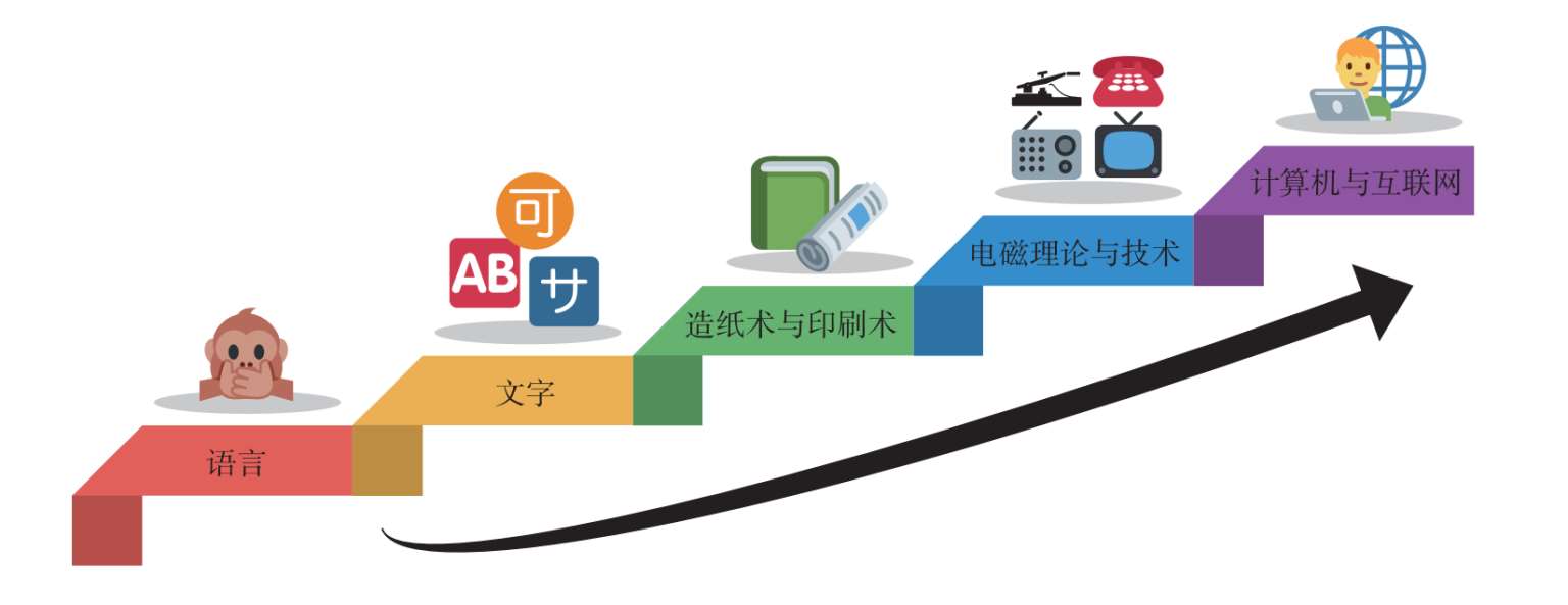 语言的产生标志着从猿到人的蜕变。大脑对世界的认知通过对话产生联系,最终形成具有共同文化的社会群体。文字的创造使人类迈向文明,书写历史。信息不再转瞬即逝,人们的思想情感、生活经验和文化习俗得以记录下来,并超越时空限制传递出去。造纸术与印刷术的发明促进了文明的交流与融合,使书籍和报刊成为信息的主要媒介,信息的存储质量和传播范围得到进一步改善。电磁理论与技术的发展深刻地影响了人们的生活、工作与娱乐方式。电报、电话和广播电视的普及使得信息的传播效率大大提高,传播形式也趋于多样化。计算机与互联网的诞生彻底地改变了人们生产和使用信息的方式。“比特”(bit)成为信息的基本单位,而“数据”被用来表示“可传输和可存储的计算机信息”。