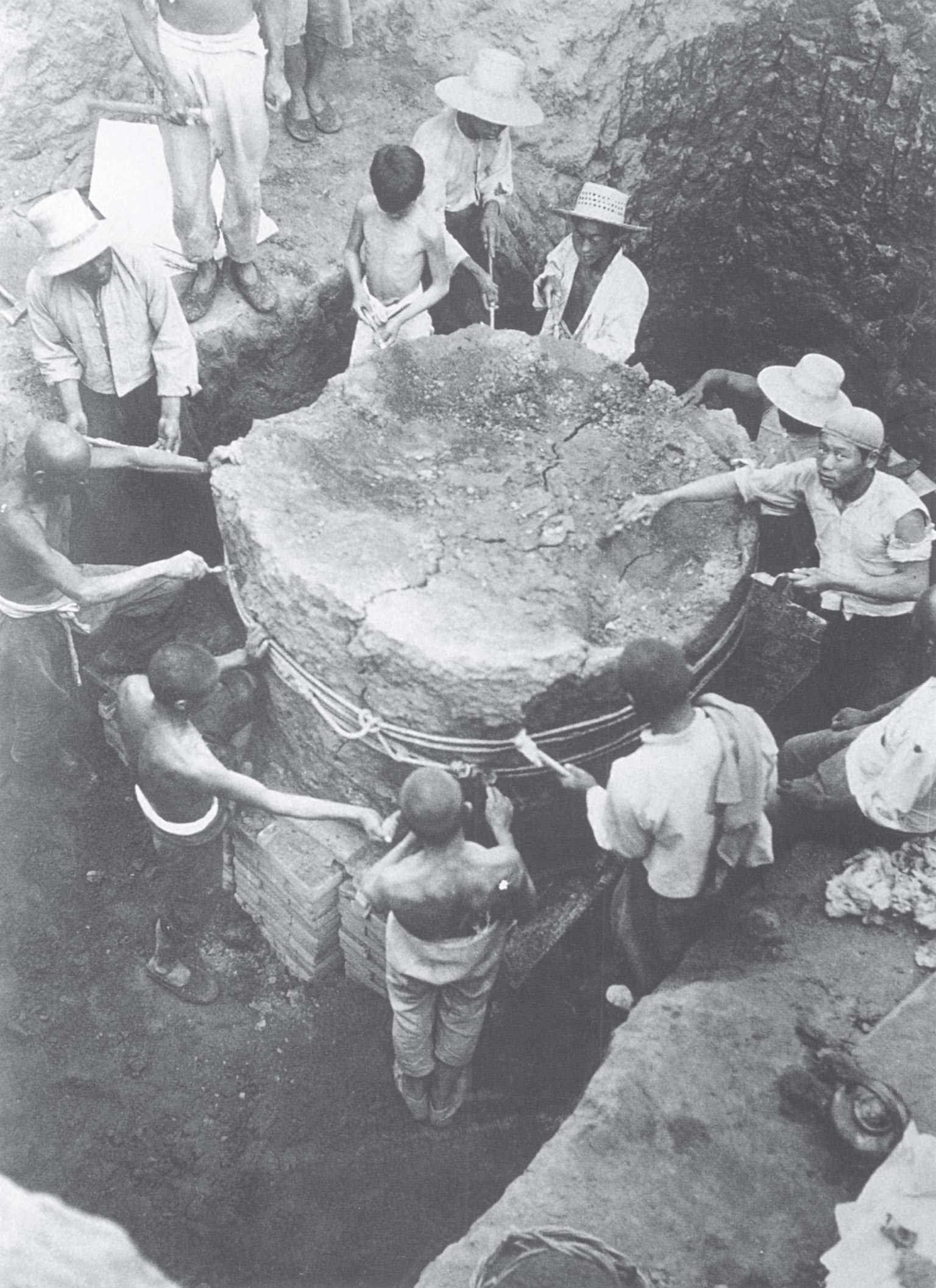 ◎1936年6月13日,中央研究院史语所考古人员在安阳殷墟H127坑发现有文字甲骨,此为用套箱法整体提取的甲骨灰土柱,准备运往南京于室内整理