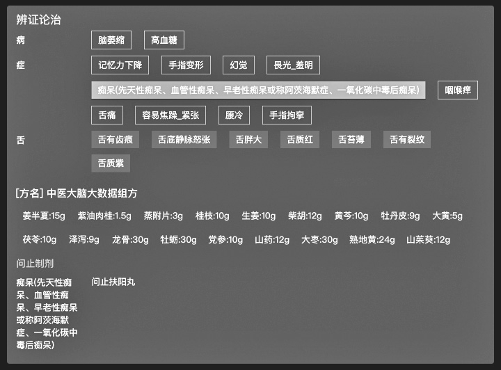 而如果以后世方派的观点来看,针对这类肾精不足引起的痴呆病,经常会用到龟鹿二仙胶这类滋阴填精、益气壮阳的方子,再加上天王补心丹、石菖蒲、葛根等药。当然在中医大脑的数据库中有更多的方剂结构和药对,往往在更复杂的症状表现中会有一些新的组合出现。在问止中医大脑的后台数据库中有更多成功的案例,以后我们会做进一步的分析和学习。希望中医在对阿尔茨海默病的治疗上有更多的突破!