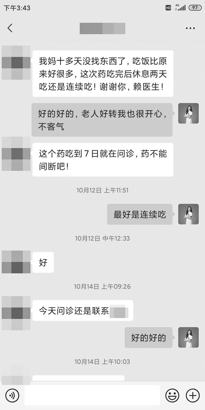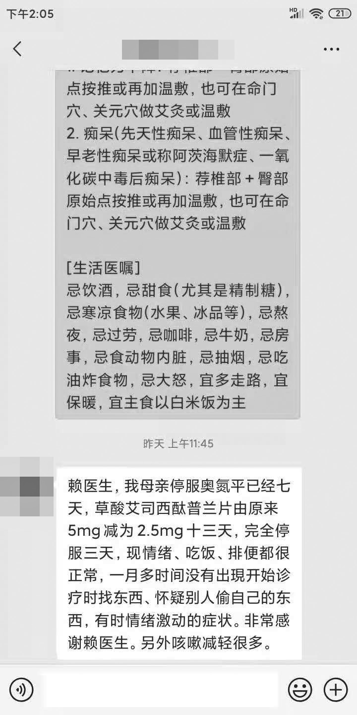 C奶奶二诊服药后,治疗开始有效果,家属信心也增强了,我也感到十分开心。三诊开方十剂。吃药期间收到C奶奶儿子的反馈说其有十多天没有找东西了,吃饭也比原来好很多。得知老人病情好转,我更为开心。