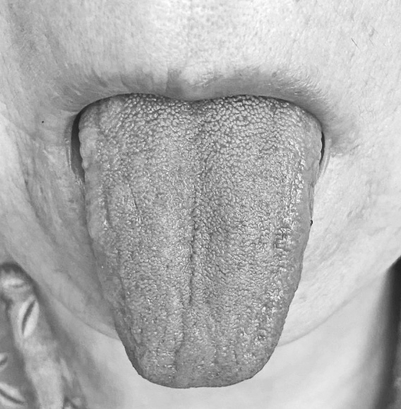 患者脊柱左侧腰部发凉;舌尖常刺痛;空腹血糖偏高,未规律服用降糖药;吃饭、睡眠正常;喝水少,不会口干、口渴;大小便正常;十指僵硬,关节变大,手掌肌肉弹性差;偶有咽喉痒,需要清嗓子;畏强光,眼睛干涩。