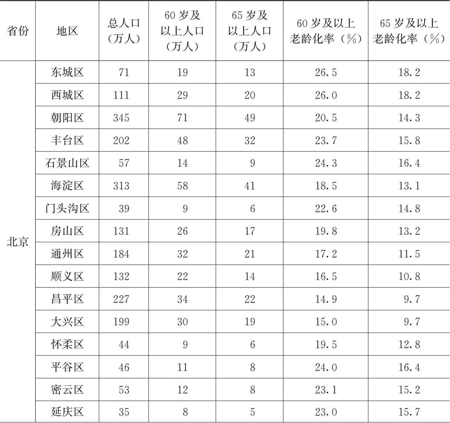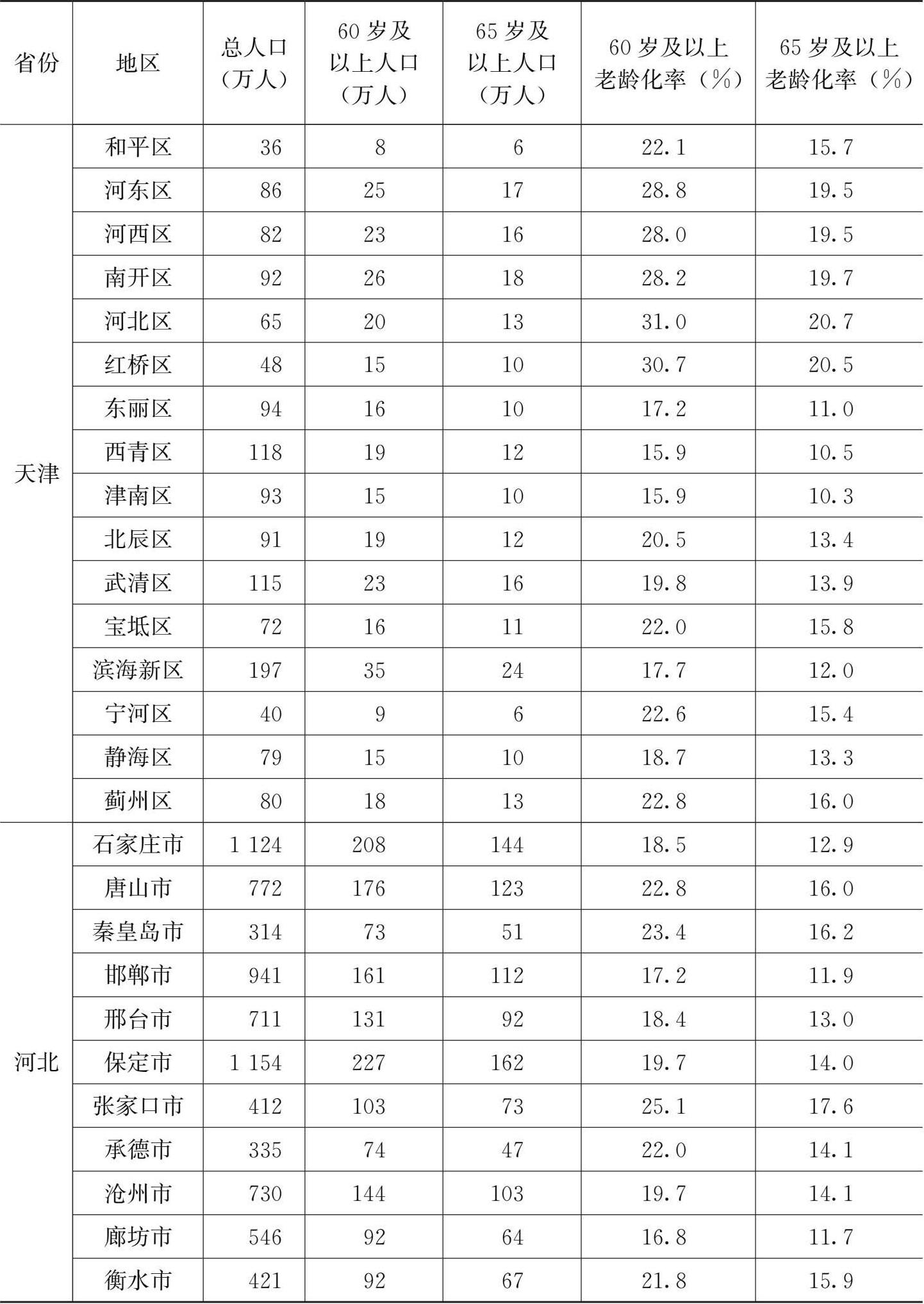 表2-3 2020年11月1日京津冀人口老龄化状况