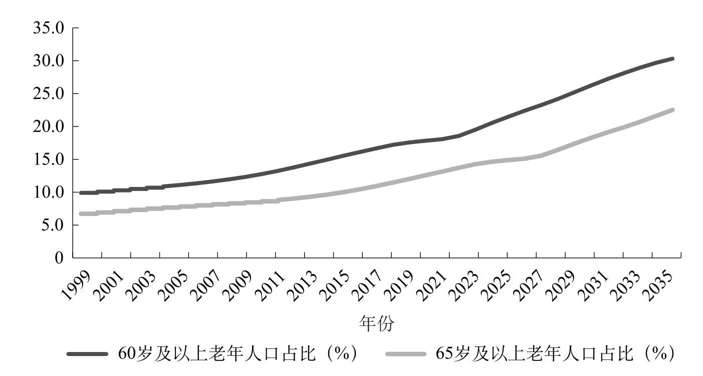 图1-6 1999—2035年中国60岁及以上、65岁及以上老年人口占总人口的比例