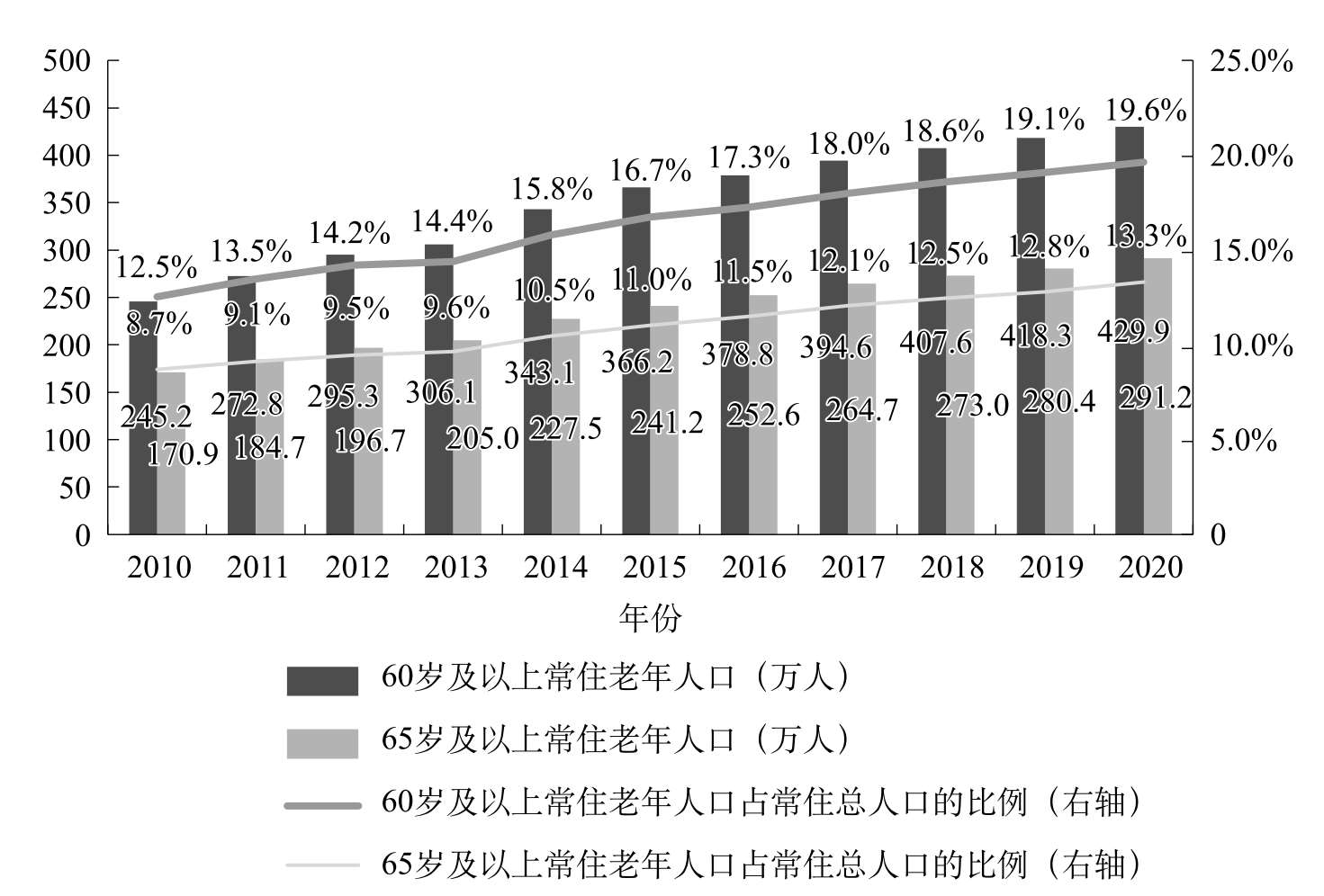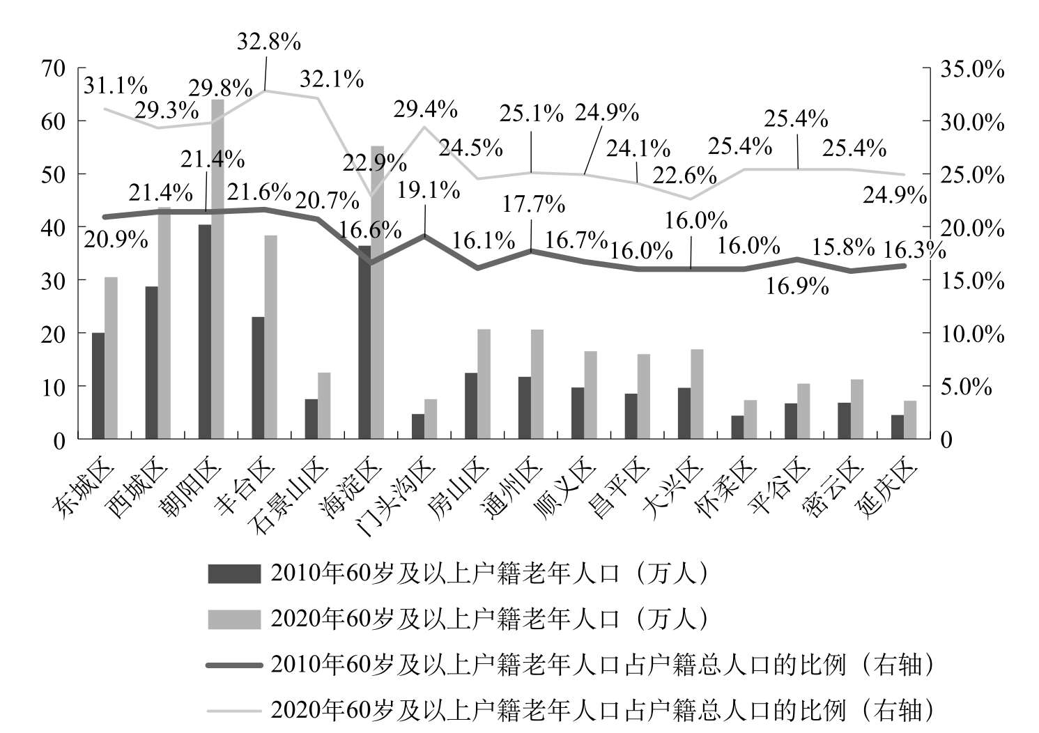 图1-2 2010—2020年北京市户籍老年人口规模及占总人口的比例