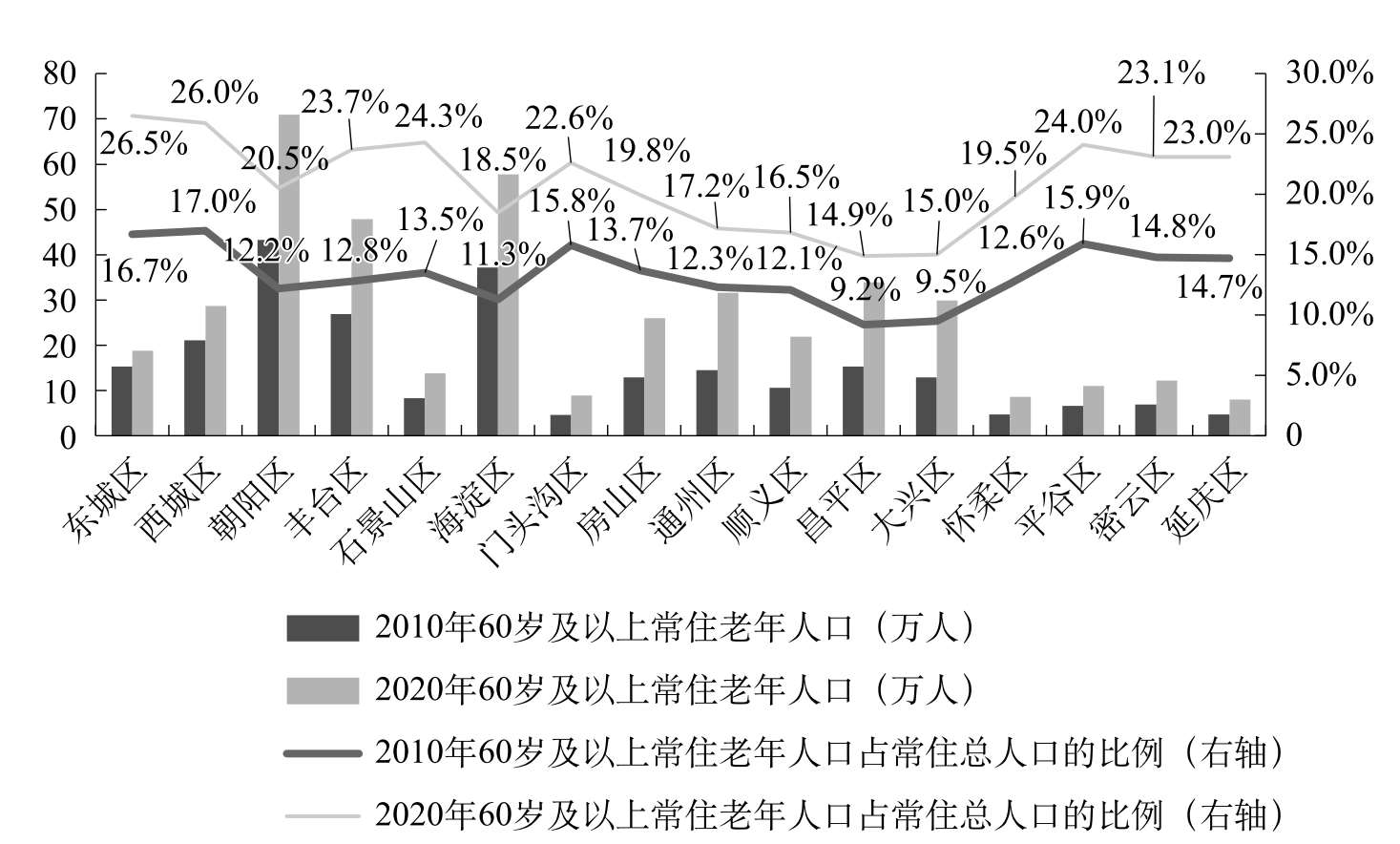 图1-1 2010—2020年北京市常住老年人口规模及占总人口的比例