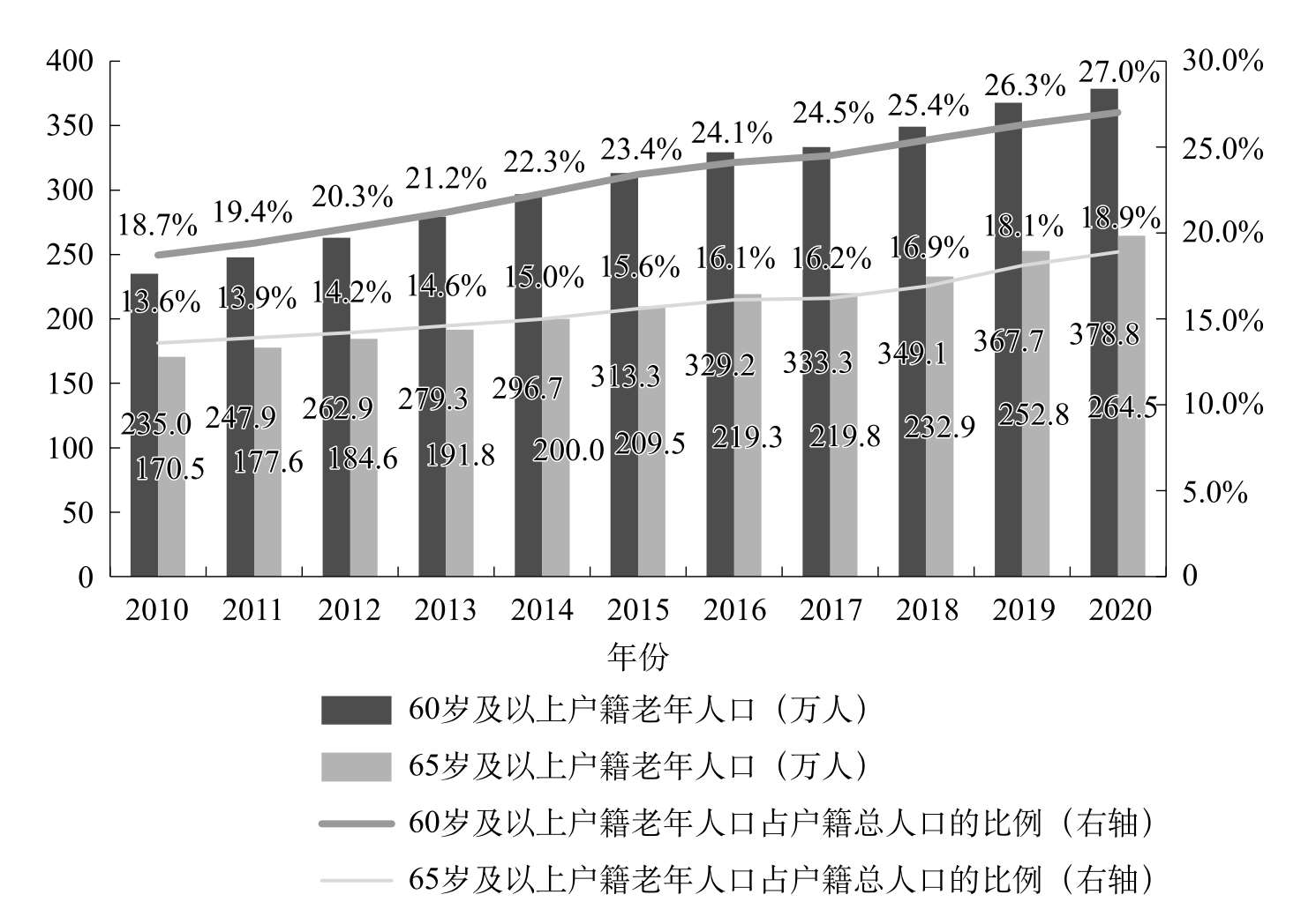 第六次全国人口普查数据显示,2010年北京市60岁及以上户籍老年人口为235.0万人,占户籍总人口的18.7%;65岁及以上户籍老年人口为170.5万人,占户籍总人口的13.6%。第七次全国人口普查数据显示,2020年北京市60岁及以上户籍老年人口为378.8万人