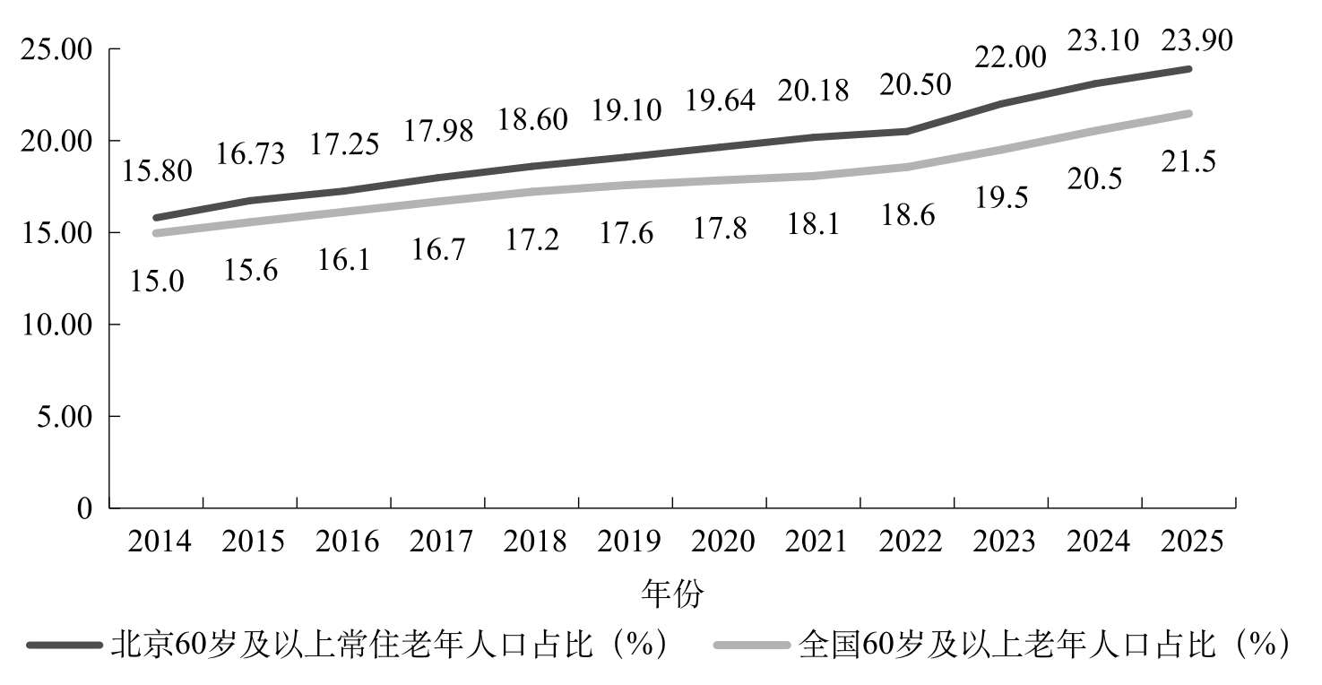 图1-7 2014—2025年北京与全国60岁及以上老年人口占比对照图