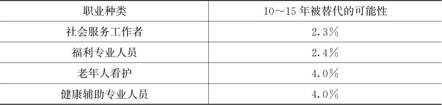 一方面,北京市建设全球数字经济标杆城市,无疑将带动人工智能、物联网、云计算、大数据等新一代信息技术和智能硬件产品的应用,对全社会的劳动力供给产生一定的人工替代效应,对劳动力数量需求降低,转而对劳动力素质提出更高的要求。另一方面,作为辅助技术,数字技术的发展也会对养老服务人才的需求产生一定的替代效应,并进一步提升养老服务行业的劳动效率,减轻养老服务从业人员的劳动力负担,这对于缓解养老人才不足是有利的。但根据目前的统计来看,养老护理员(从事养老看护的职业种类)被人工智能替代的概率较低,这也可理解为与人类感情交互越多的职业工种,被替代的可能性越低。牛津大学、麦肯锡公司、普华永道会计师事务所、创新工厂等的研究报告对从2018年起之后10~15年365类工作被取代的概率进行预测显示,与养老服务相关的职业种类被替代的可能性均在5%以下(见表2-1)。