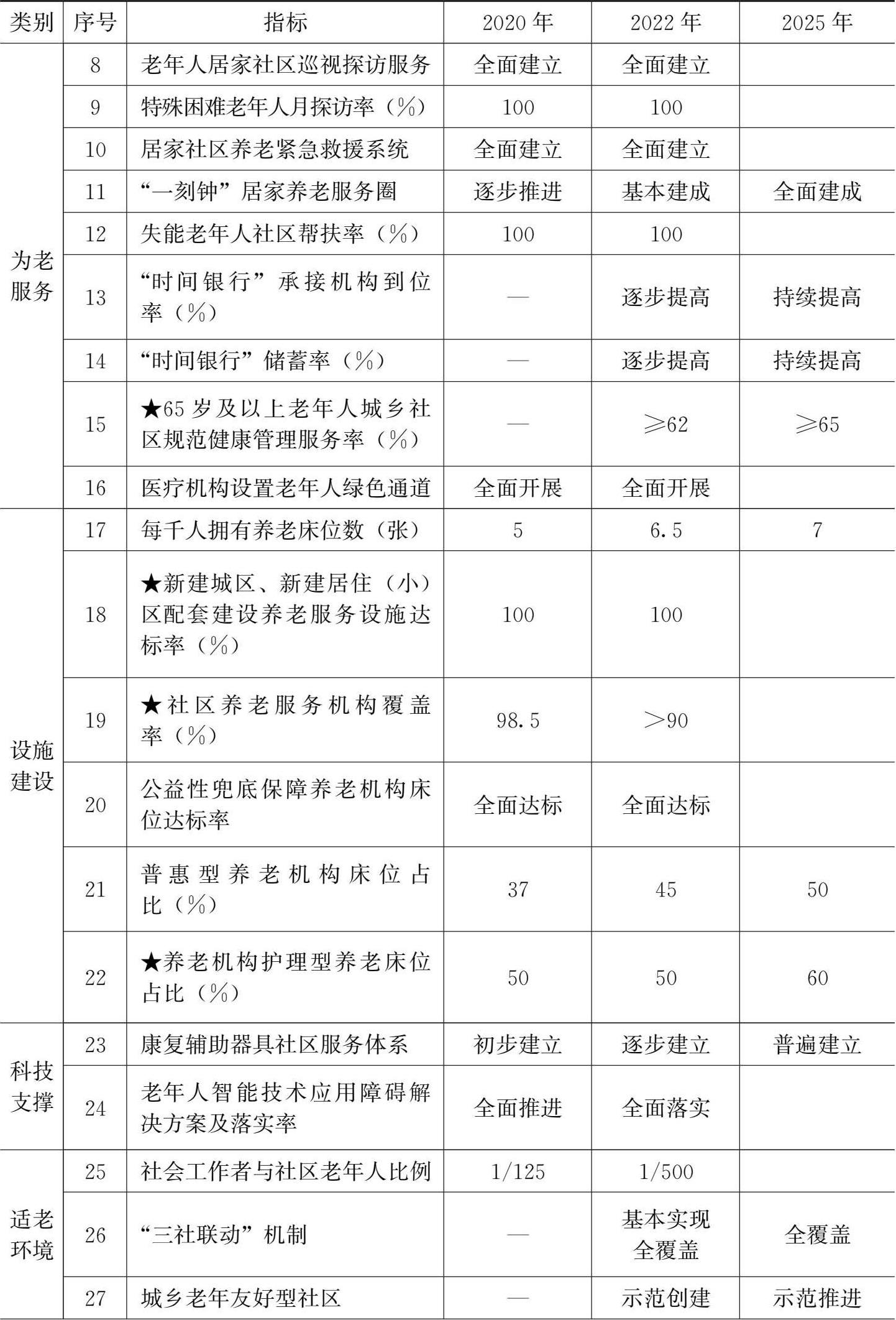 2019年11月,中共中央、国务院印发《国家积极应对人口老龄化中长期规划》,从夯实应对人口老龄化的社会财富储备,改善人口老龄化背景下的劳动力有效供给,打造高质量的为老服务和产品供给体系,强化应对人口老龄化的科技创新能力,构建养老、孝老、敬老的社会环境五个方面部署了具体工作任务,提出了22项积极应对人口老龄化评价指标(包括9个约束性指标)。这些指标涉及社会保障、养老服务、健康服务、老年宜居环境、老年教育五个维度,其中:社会保障领域指标包括基本养老保险参保率和基本医疗保险参保率;养老服务领域指标有15个之多,涵盖养老服务设施、养老服务能力、兜底性养老服务保障等多个方面;健康服务领域指标包括老年人健康管理率和医疗机构设置绿色通道;老年教育领域指标包括老年大学覆盖面和经常性参加教育活动的老年人占比。这一指标体系既能体现积极应对人口老龄化的工作状况和发展水平,更强调了积极应对人口老龄化的支撑能力,重点强调了政府的职责,为衡量、考核和推动各地区积极应对人口老龄化工作提供了抓手,也成为北京市实施积极应对人口老龄化国家战略的行动指南。