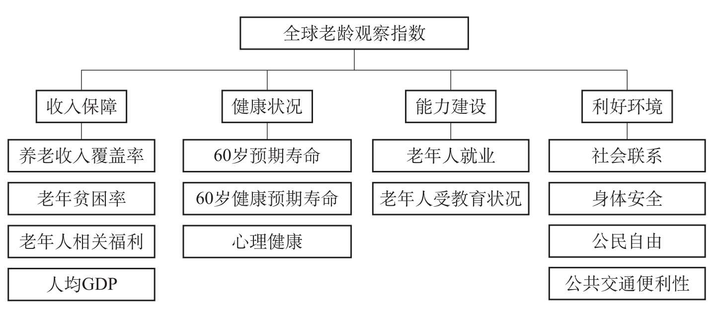 如何科学开展积极老龄化政策实践的监测评估一直是国际社会关注的话题。联合国人口基金会和国际助老协会始终致力于跟进《马德里老龄问题国际行动计划》执行情况的基本指标清单的形成,发布相关审查报告,推动有关政策行动的监测与评估。2014年10月1日由联合国首次发布的《全球老龄观察指数深度报告(2014)》,开发建立了一项衡量全球积极老龄化政策实践情况的工具——全球老龄观察指数,如图2-3所示。该指数旨在评估世界不同国家和地区作用于提升老年人生活质量的政策,通过衡量四个关键领域老年人的生活质量和福祉,来综合地测量老年人生活质量的整体水平。这一指标体系尽管是从老年人生活质量视角出发,但也能客观真实地反映出一个国家或地区人口老龄化的整体发展状况,体现出一个国家或地区积极应对人口老龄化的支撑能力。比如老年人的收入保障、健康状况更能直观和准确地反映出一个国家或地区实施积极应对人口老龄化工作的实际效果。利好环境则体现了敬老、孝老、养老的良好的社会氛围,体现出社会参与的状况。而能力建设指标是以老年人作为主体,从老年人就业和老年人受教育状况两方面反映老年人的权益保障情况,而不是将政府作为主体来评价政府工作效能,但也能更为突出地反映出政府的主要工作效能。