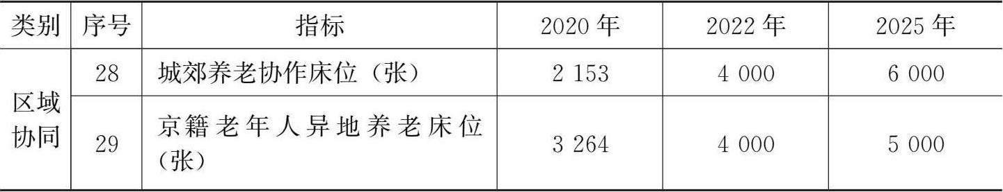 2021年12月,中共北京市委、北京市人民政府发布《北京市积极应对人口老龄化实施方案(2021年—2025年)》,该方案基于国家指标要求,结合北京市实际,制定了北京市积极应对人口老龄化能力评价指标(见表2-2),共包括保障制度、人力资源、为老服务、设施建设、科技支撑、适老环境、区域协同7个维度,29项指标。其中9项约束性指标与国家规划保持一致,具体为:基本养老保险参保率(%),基本医疗保险参保率(%),生活不能自理特困人员集中供养率(%),有集中供养意愿的特困人员集中供养率(%),老年大学覆盖面,65岁及以上老年人城乡社区规范健康管理服务率(%),新建城区、新建居住(小)区配套建设养老服务设施达标率(%),社区养老服务机构覆盖率(%),养老机构护理型养老床位占比(%)等。