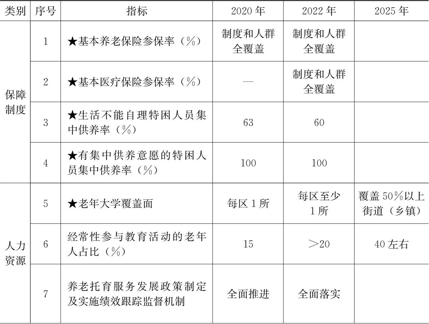 2021年12月,中共北京市委、北京市人民政府发布《北京市积极应对人口老龄化实施方案(2021年—2025年)》,该方案基于国家指标要求,结合北京市实际,制定了北京市积极应对人口老龄化能力评价指标(见表2-2),共包括保障制度、人力资源、为老服务、设施建设、科技支撑、适老环境、区域协同7个维度,29项指标。其中9项约束性指标与国家规划保持一致,具体为:基本养老保险参保率(%),基本医疗保险参保率(%),生活不能自理特困人员集中供养率(%),有集中供养意愿的特困人员集中供养率(%),老年大学覆盖面,65岁及以上老年人城乡社区规范健康管理服务率(%),新建城区、新建居住(小)区配套建设养老服务设施达标率(%),社区养老服务机构覆盖率(%),养老机构护理型养老床位占比(%)等。