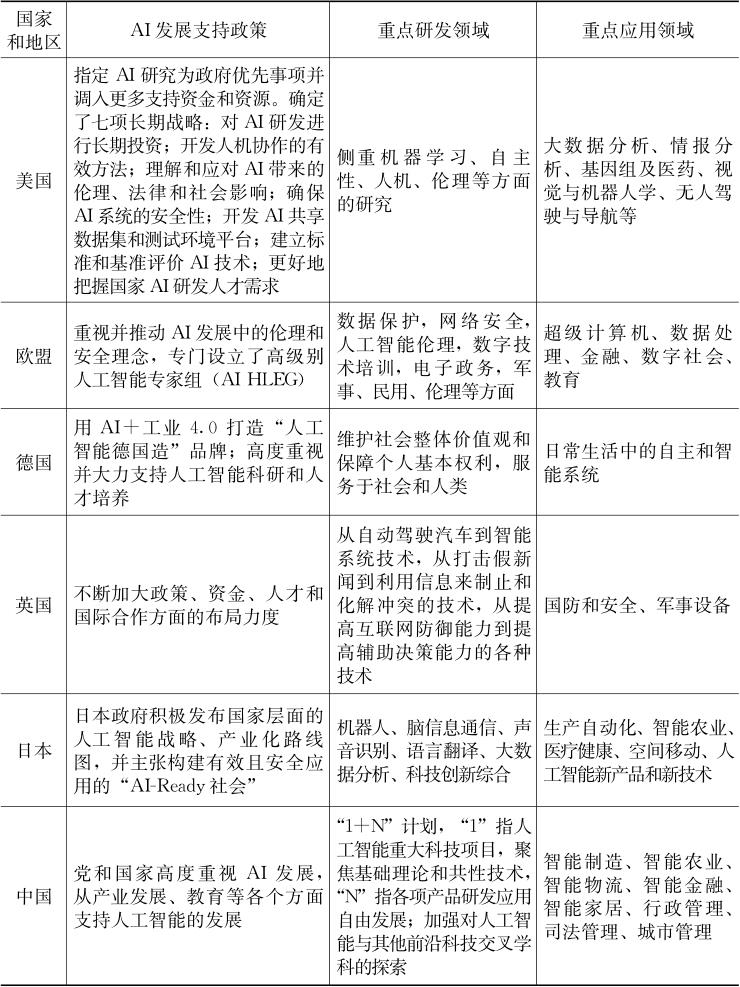表1-1 世界各国人工智能布局特点及研发策略比较分析