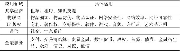 目前,区块链已经涉及物联网、智能制造、供应链管理与数字资产交易等领域,并为数字经济的转型及其应用的丰富化提供了可能(见表1-2)。比如,2016年8月微软在Azure云平台里面提供区块链,开发者可以在上面以最简便、高效的方式创建区块链环境,而区块链网络的去中心化特点也为物联网的自我治理提供了方法,有助于实现对平台的有效控制。此外,区块链的通证化使得大件实物资产部分所有权成为可能,降低了投资与交易门槛,其智能合约又能够保障市场规则、提高结算速度,因此区块链也是构建数字资产交易平台的最优选择。