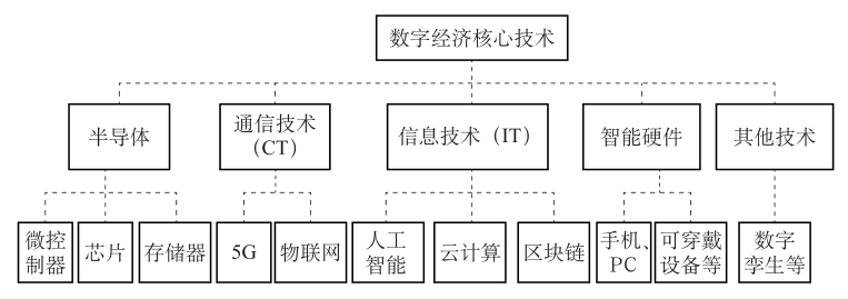 中对我国数字技术做了非常详细的论述。本章主要参考这个报告,结合其他资料,主要从国际对比的角度对我国数字技术的发展现状做全面总结。《数字经济核心科技深度报告:AI+5G是数字时代通用技术平台》认为数字经济的核心技术主要包括半导体、通信技术(CT)、信息技术(IT)、智能硬件。本书在此基础上增加以数字孪生为代表的其他技术,这些核心技术是支撑数字经济发展的基座。半导体作为最基础的计算存储硬件单元,广泛应用于芯片、光电子、人工智能等领域,是电子工业与数字经济的基石。以5G、物联网为代表的通信技术是数字经济的链接渠道,发挥着数据传输的功能。而以人工智能、云计算与区块链技术为代表的信息技术是数字经济的核心,决定了数字企业的数据收集、计算处理能力,决定了数字企业的价值创造能力。智能硬件(包括手机、PC、可穿戴设备等)相当于数字经济的“网络神经末梢”,实现用户与数字企业的交互。除此之外,数字孪生等其他技术也愈加受人重视,其以数字方式为物理对象创建虚拟模型,对实现信息技术与智能制造的融合极为重要(见图1-1)。