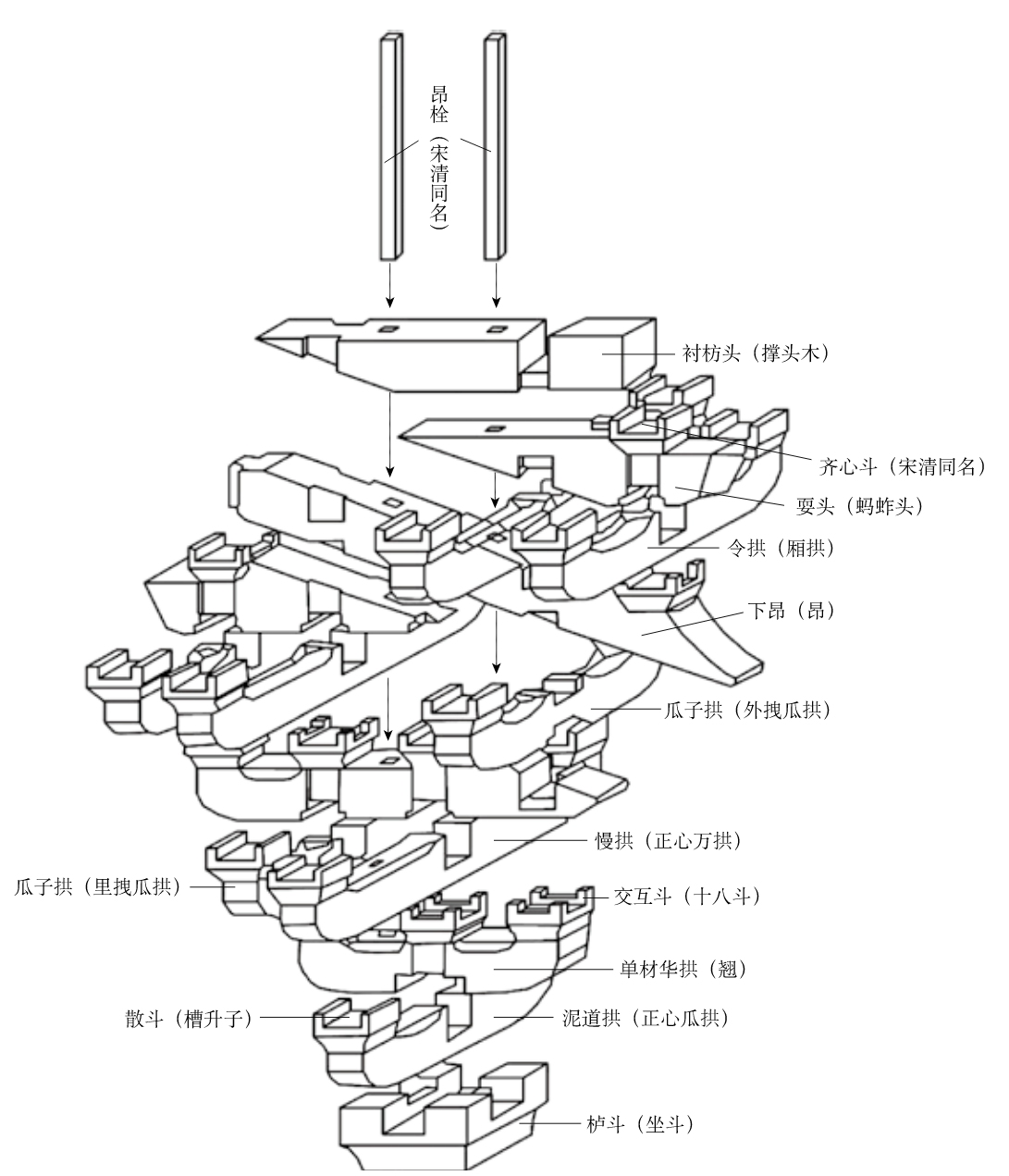 宋式补间铺作斗拱构造示意图(宋、清名称对照,括号中名为清名)