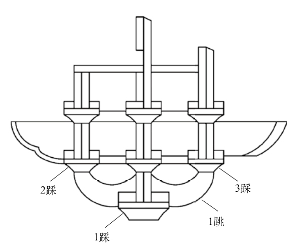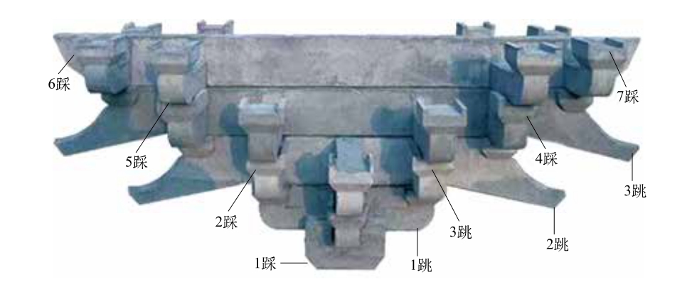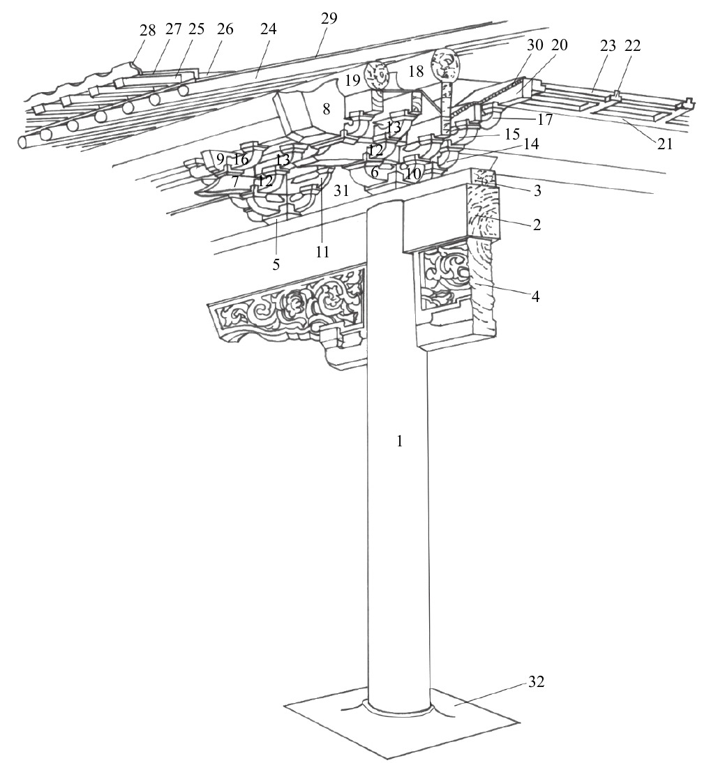 1—檐柱;2—额枋;3—平板枋;4—雀替;5—坐斗;6—翘;7—昂;8—桃尖梁头;9—蚂蚱头;10—正心瓜拱;11—正心万拱;12—外拽瓜拱;13—外拽万拱;14—里拽瓜拱;15—里拽万拱;16—外拽厢拱;17—里拽厢拱;18—正心桁;19—挑檐桁;20—井口枋;21—贴梁;22—支条;23—天花板;24—檐椽;25—飞椽;26—里口木;27—连檐;28—瓦口;29—望板;30—盖斗板;31—拱垫板;32—柱础