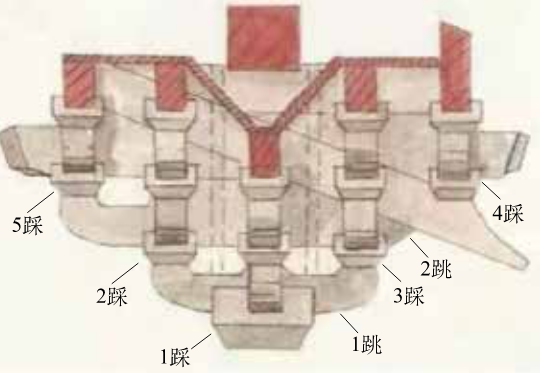 斗拱,位于梁枋、檐檩之间,从梁枋上一层层探出的弓形承重构件叫拱,拱与拱之间的方形木块叫斗,二者合称斗拱。斗拱由斗、拱、升、翘、昂、耍头等构件组成,一组斗拱组成“科”与“铺作”(宋代称一朵,清代称一攒)。根据安装部位进行分类,位于柱头上的称柱头科,位于房屋角柱上的称角科,分布于柱间的称平身科。跳与踩的对应关系是以檐柱为中心,斗拱向内外两侧挑出,每挑出一步,称“一跳”;踩是就斗的数量而言,将正心拱(泥道拱)计算在内,里外各出一跳,出现包括坐斗在内的三个斗,称三踩,斗拱称三踩斗拱,出二跳,则内外各增加一个斗,共五斗,称五踩斗拱,出三跳为七踩斗拱,出四跳为九踩斗拱,等级越高出挑越多,牌坊斗拱可最多做到十一踩。