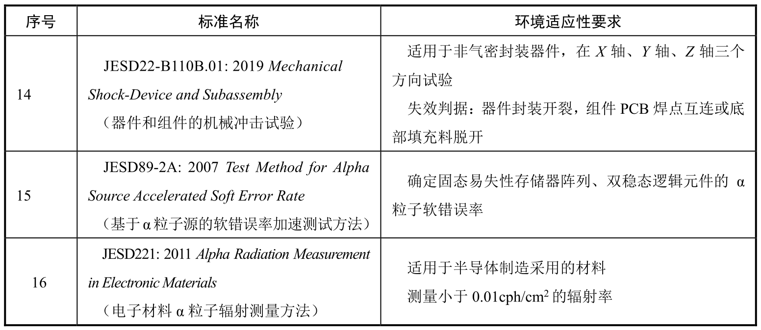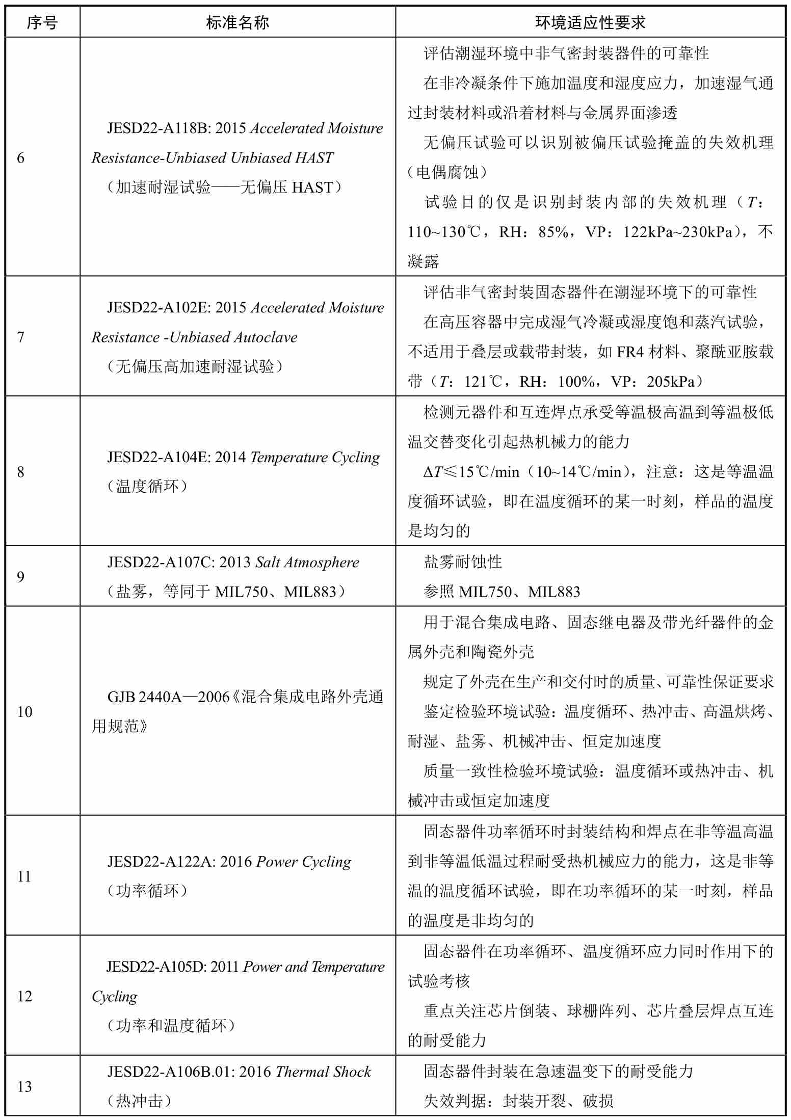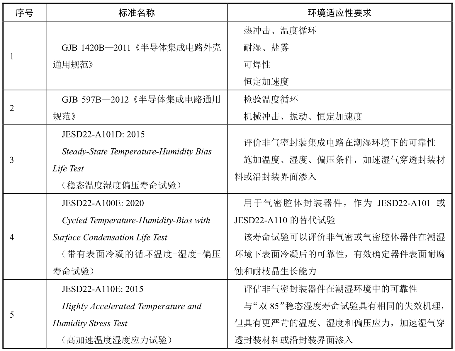 集成电路封装环境适应性采用各类环境试验结果来表征,包括温度冲击、高低温、高温高湿、盐雾、机械冲击等环境试验,相关试验标准见表2-16。